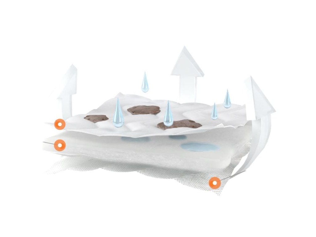 - třívrstvý potah (konstrukce 3W): matracový úplet, načechraná polyesterová netkaná textilie a plochá polypropylenová netkaná textilie