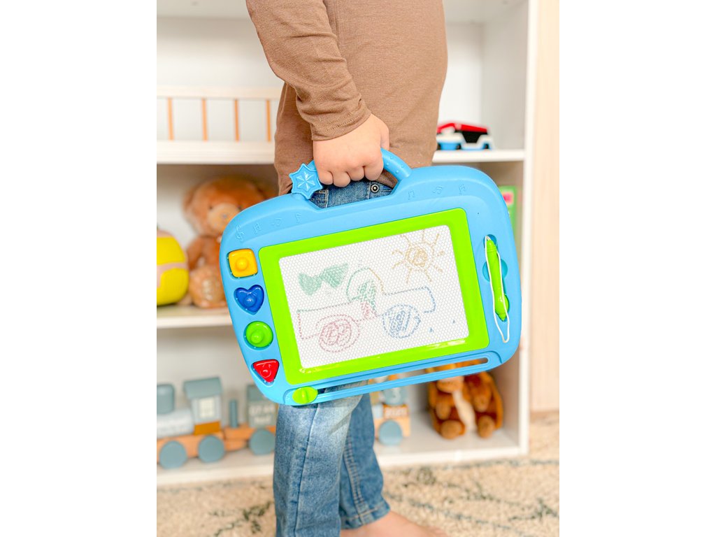 Na magnetickú tabuľku kreslíš priloženým perom. Môžeš použiť aj priložené razítka. Jedným ťahom je možné obrázok zmazať a môžeš začať znova maľovať.