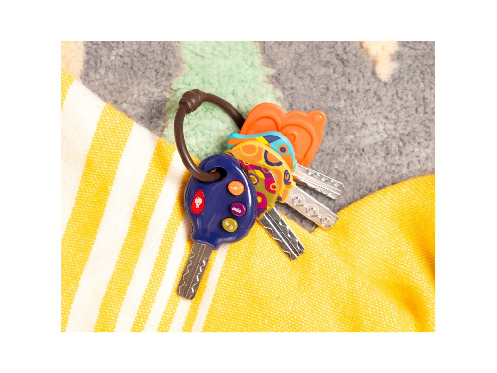 Štyri kľúče ako od ozajstného auta na krúžku s príveskom. Jeden z kľúčov má ovládač s tromi rôznymi zvukmi a svetielkom. Odolný materiál bezpečný na skúmanie rúk i ústy.