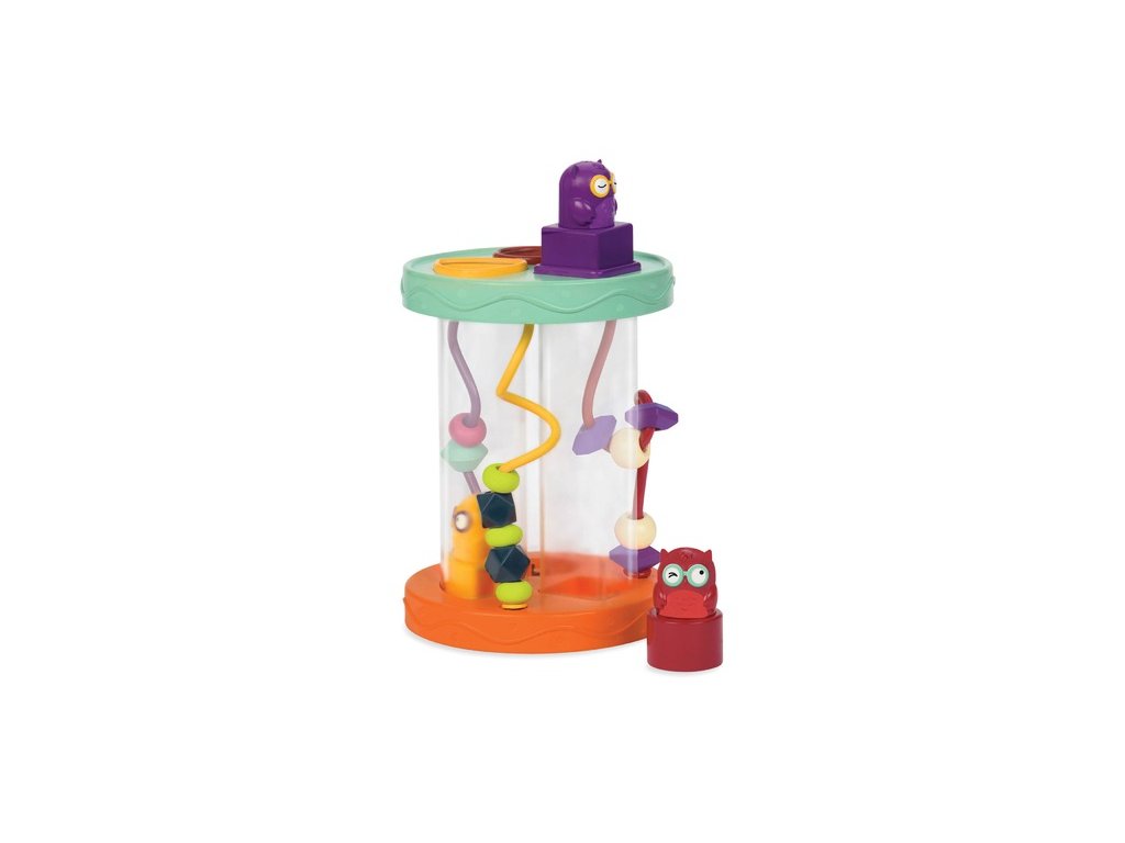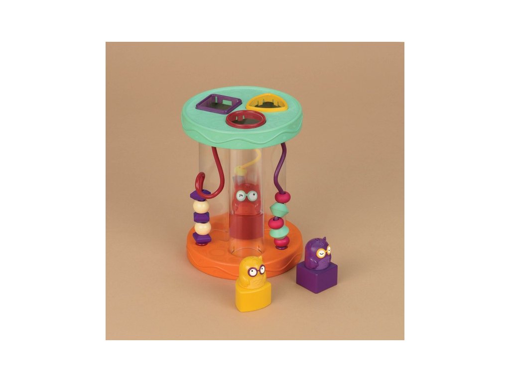 Multifunkčná hračka s húkajucími sovičkami. Tri malej sovy so základňou rôznych tvarov po vložení správneho otvoru kĺžu dole a húkajú. Hračku je možné položiť na zem a kotúľať ako valec. Rozmery: výška 21 cm, priemer valca 15 cm. Vhodné pre deti od 6 mesiacov do 3 rokov.