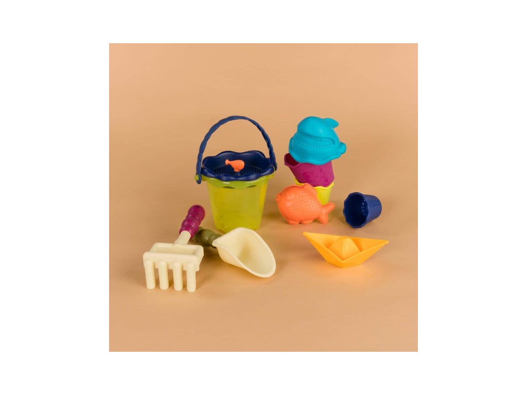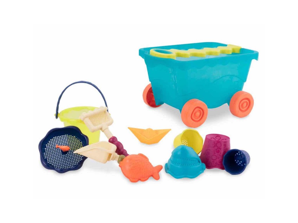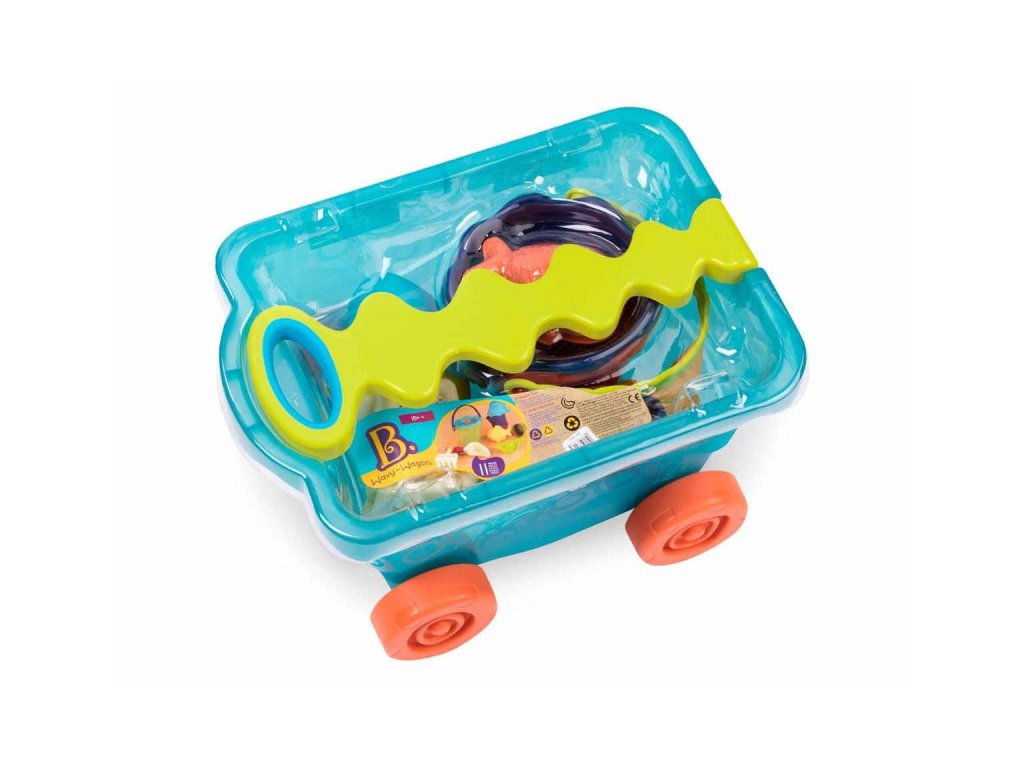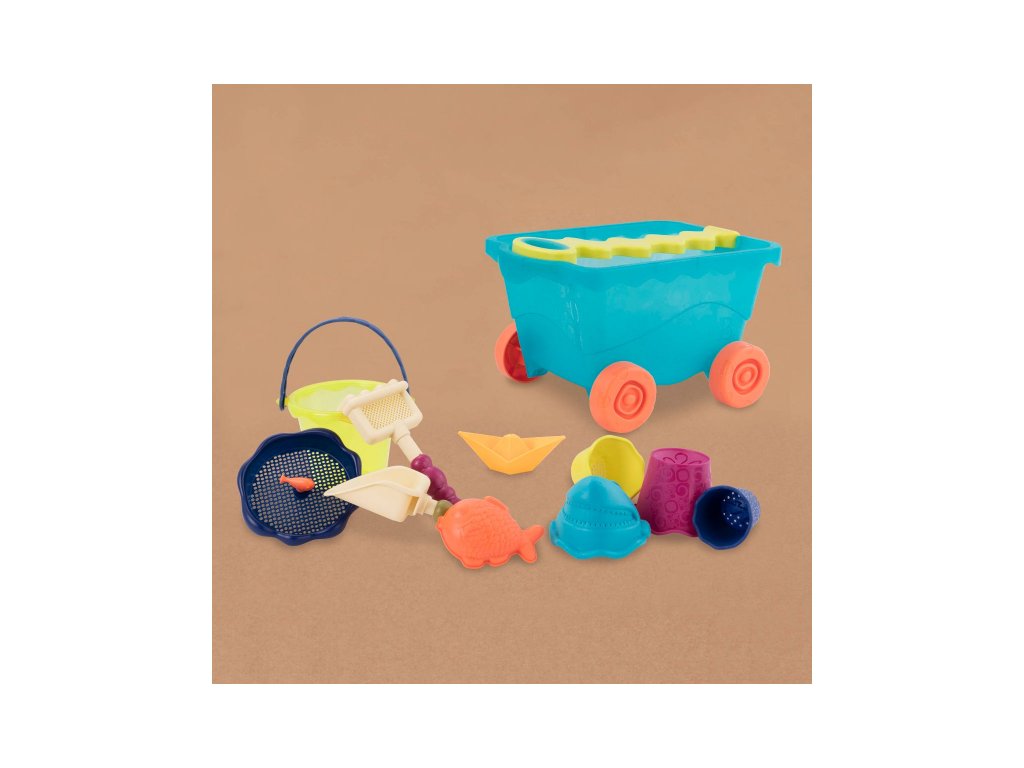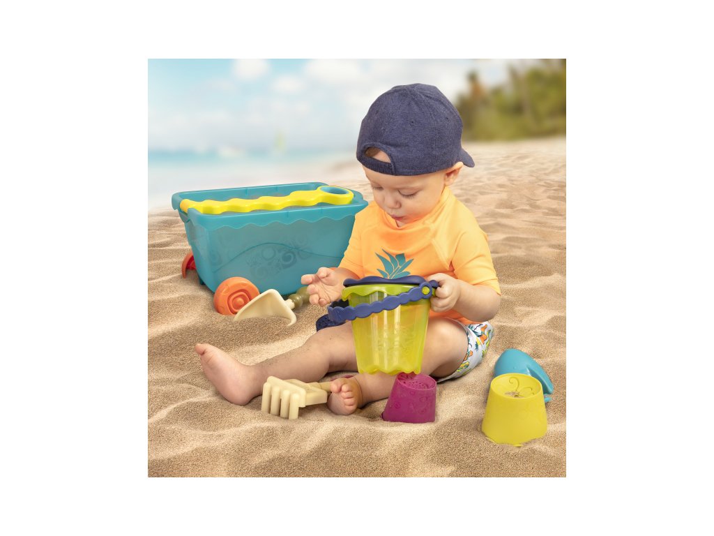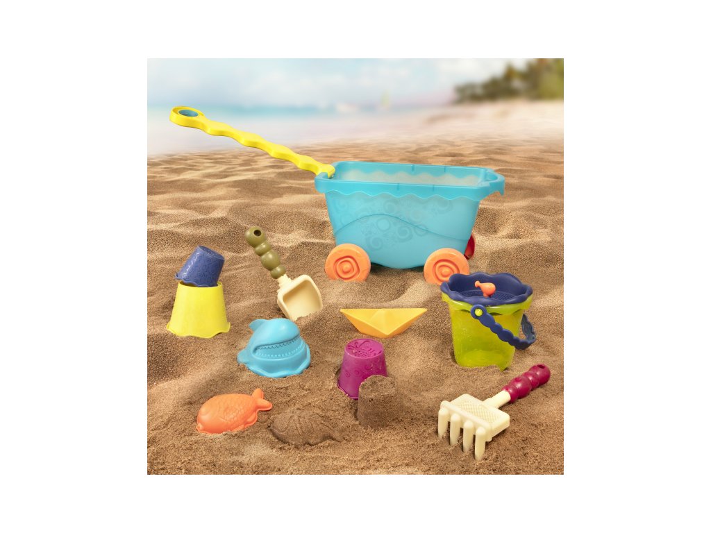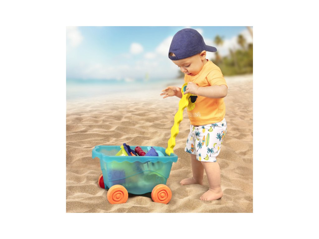 Výprava na pláž alebo na pieskovisko môže začať! Vo vozíku so 4 kolesami a dlhým držadlom nájdete všetko, čo potrebujete na hranie s pieskom a vodou: vedierko s držadlom, sitko, 3 tégliky s jedným viečkom v tvare žraloka, formičku na piesok v tvare rybičky, hrabličky, lopatku a lodičku.