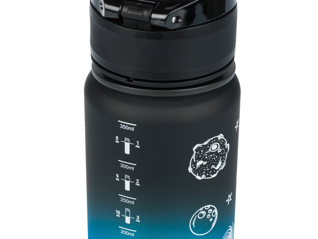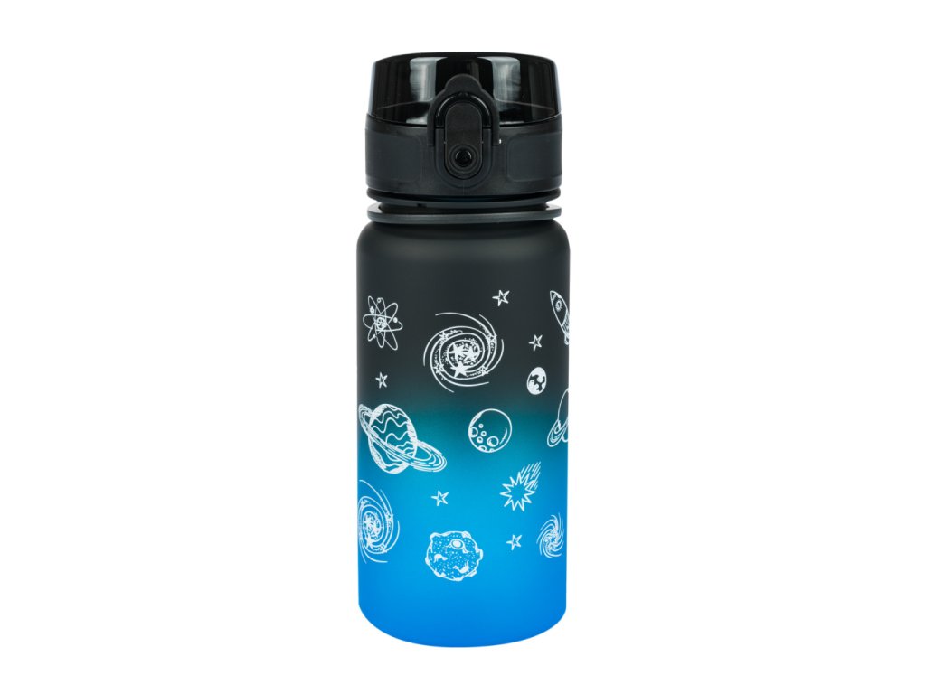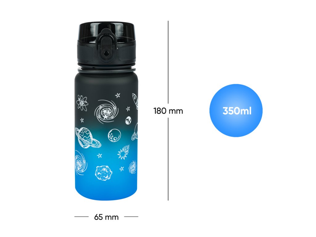 Tritanová fľaša pre deti Gradient Vesmír 350 ml V školskej výbave nesmie chýbať poriadna fľaša na nápoje Fľaša od BAAGLa je vhodná ako do školy, tak aj na výlety alebo na športový krúžok. Uzamykateľné viečko neprepustí ani kvapku nápoja a zabezpečuje jednoduchú a intuitívnu manipuláciu. Súčasťou fľaše je sitko, vďaka ktorému môžete fľašu použiť i na limonády s ovocím alebo čaj (materiál je vhodný aj na horúce nápoje). K fľaši je pripevnené pútko, ktoré umožňuje pohodlné nosenie v ruke.Certifikovaný tritánový materiál zaručuje maximálnu bezpečnosť a kvalitu nápoja Nevydáva nepríjemný plastový zápach, ako je to pri iných plastových materiáloch, a zároveň neobsahuje žiadne zdraviu škodlivé látky (BPA, PVC, ftaláty, či iné). Ostatne, výrobky z tritánu sa používajú aj v zdravotníctve. Používaním fľaše znížite plastový odpad z jednorazových PET fliaš a pomôžete tak znížiť objem vyprodukovaného plastového odpadu, ktorý doteraz končí prevažne na skládkach, v spaľovniach, alebo často aj v prírode.Objem fľaše je 350 ml.