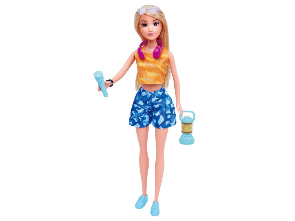 Bábika Anlily v sade Camping holiday s doplnkami. Bábika má na sebe kraťasy a top. Doplnky: foťák, kabelka, slúchadlá, slnečné okuliare, náhrdelník a žabky. Výška bábiky: 30 cm. Rozmery balenia: 32 x 18 x 5 cm. Vek: 3+
