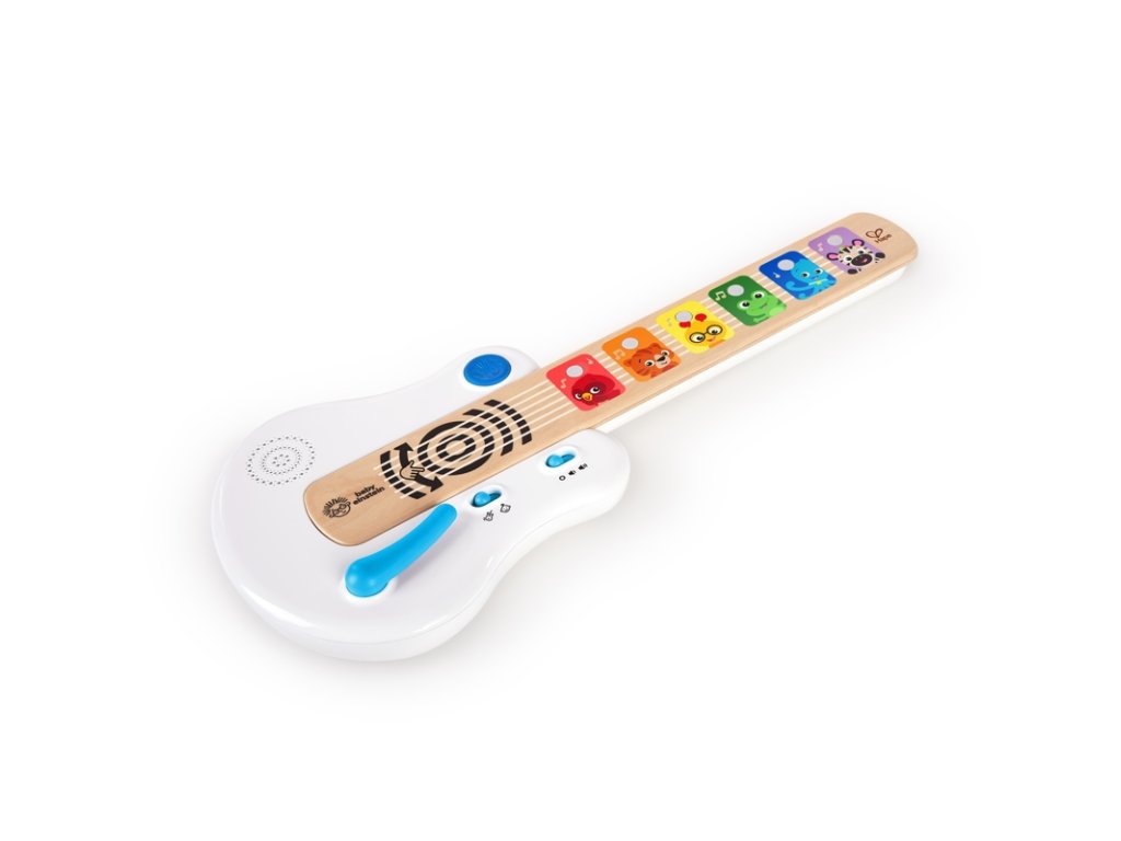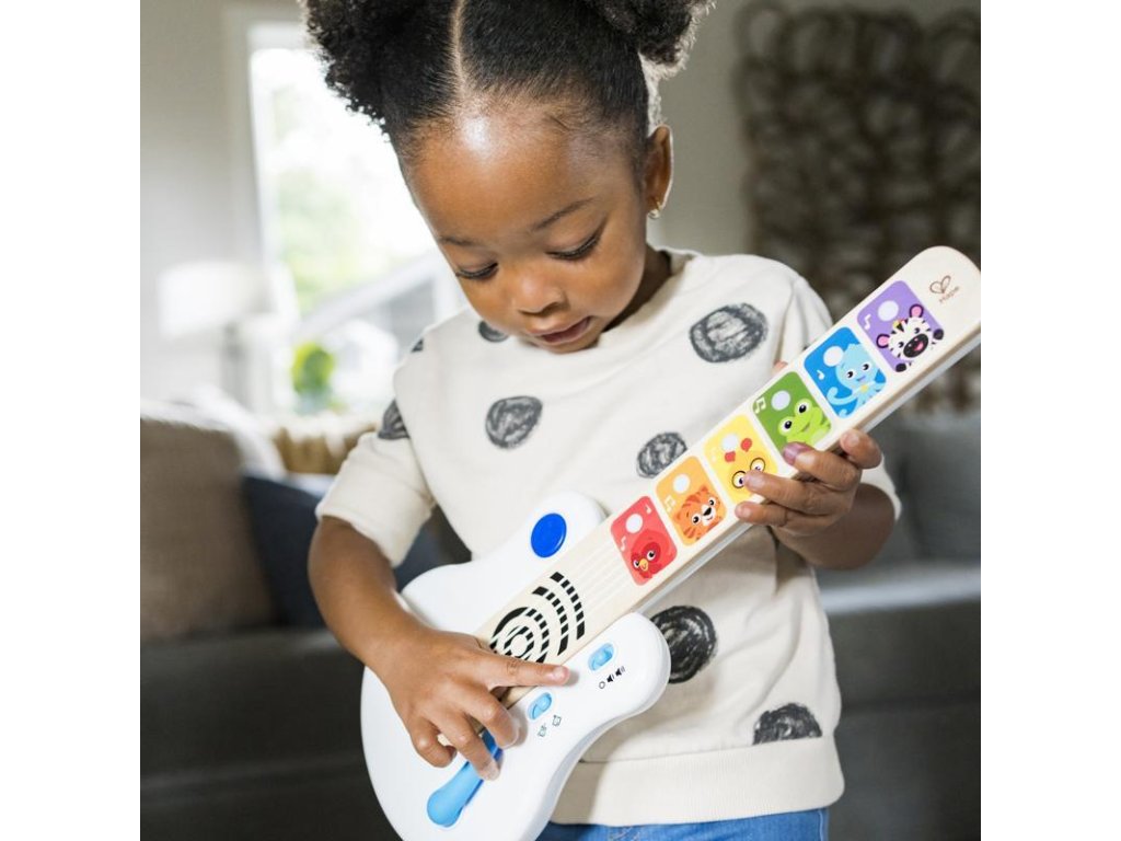 Táto drevená hračka je vybavená ocenenou technológiou Magic Touch, vďaka ktorej máte hudbu na dosah ruky ... bez potreby tlačidiel alebo strún! Realistické zvuky gitary reagujú na brnkavé pohyby vášho dieťaťa. Vaša budúca rocková hviezda môže vytvárať vlastné kombinácie akordov alebo hrať s vopred nahratými melódiami. Pomocou tremola sa prepnete do režimu, kde získate ďalšie zvukové efekty. Táto hračka podporuje rozvoj senzorických a motorických schopností. Podporte tvorivosť a lásku k hudbe s prvou gitarou dieťaťa!