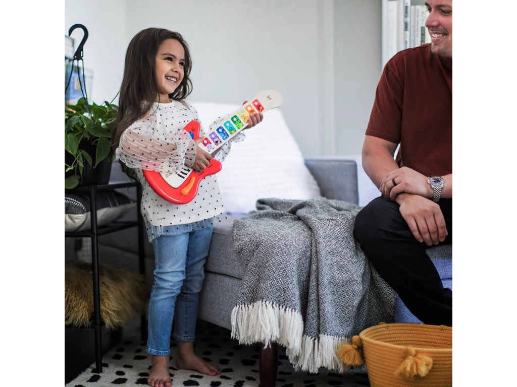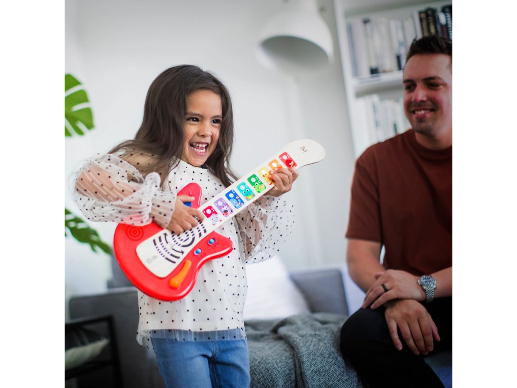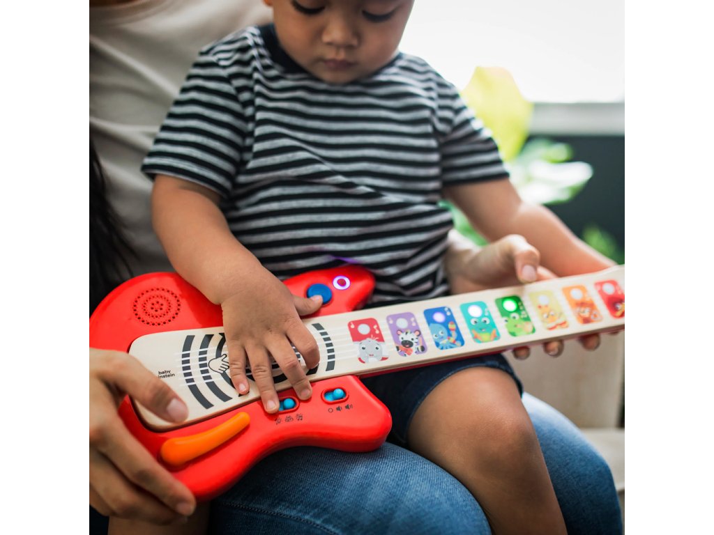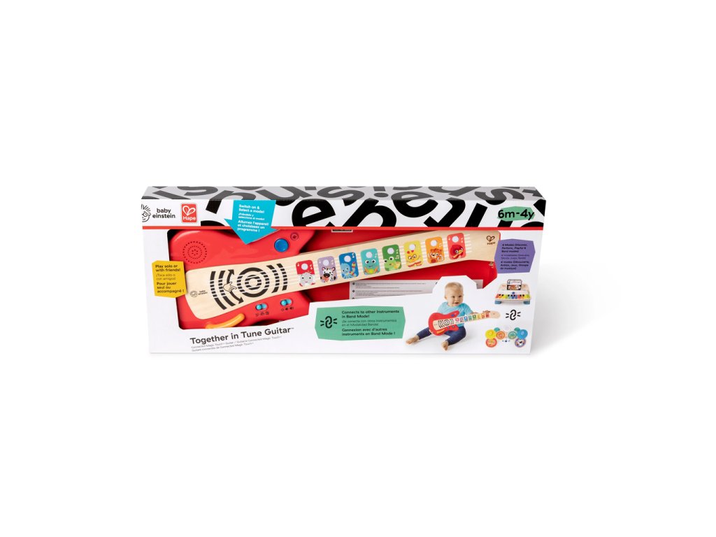 Chcete naučiť svoje deti hrať sa spolu v harmónii? Together in Tune Guitar™ je drevená hudobná hračka, ktorá im umožňuje džemovať samostatne alebo spolu so súrodencami a priateľmi. Bezdrôtovo sa pripája k ostatným nástrojom Together in Tune™ v dosahu a automaticky sa harmonizuje, čím vytvára nádhernú hudbu, ktorú si mama a otec užijú rovnako ako ich dojčatá a batoľatá. Bezpečné bezdrôtové spojenie medzi prístrojmi funguje ako vysielačka cez rádiové signály. Táto detská gitara v spolupráci medzi Hape™ a Baby Einstein™ podporuje rozvoj jemných motorických schopností. Technológia Magic Touch™ spája trvanlivosť a hodnotu klasickej drevenej hračky s najnovšou technológiou hudobných hračiek súčasnosti. Dokonca aj najjemnejšie poklepanie na celú oktávu farebných maľovaných pražcov vydáva skutočné gitarové zvuky. Táto detská gitara Baby Einstein, ktorá obsahuje 4 režimy (režim objavuj; režim predvádzania; režim hrania; režim kapely) a 10 populárnych melódií, dáva dieťaťu slobodu vytvárať si vlastné beaty, vrstviť riffy a jednoduché zvuky, rozhýbať sa a ovládať svoje obľúbené piesne. Ak hľadáte hudobnú hračku ako darček na oslavu bábätka alebo na prvé narodeniny, toto je tá správna. Vďaka drevenému dizajnu bez gombíkov sa táto hračka pre batoľatá mimoriadne ľahko čistí. Zahŕňa ovládanie hlasitosti Vypnúť/Nízka/Vysoká. Vhodné pre batoľatá a deti od 6 mesiacov.
