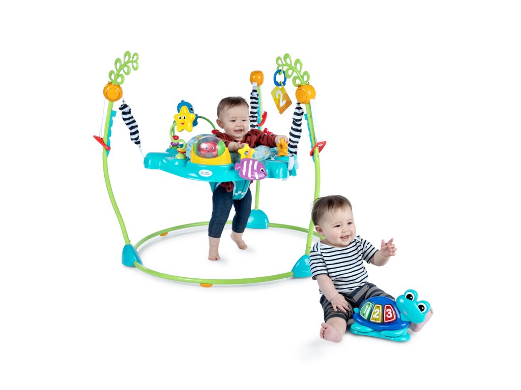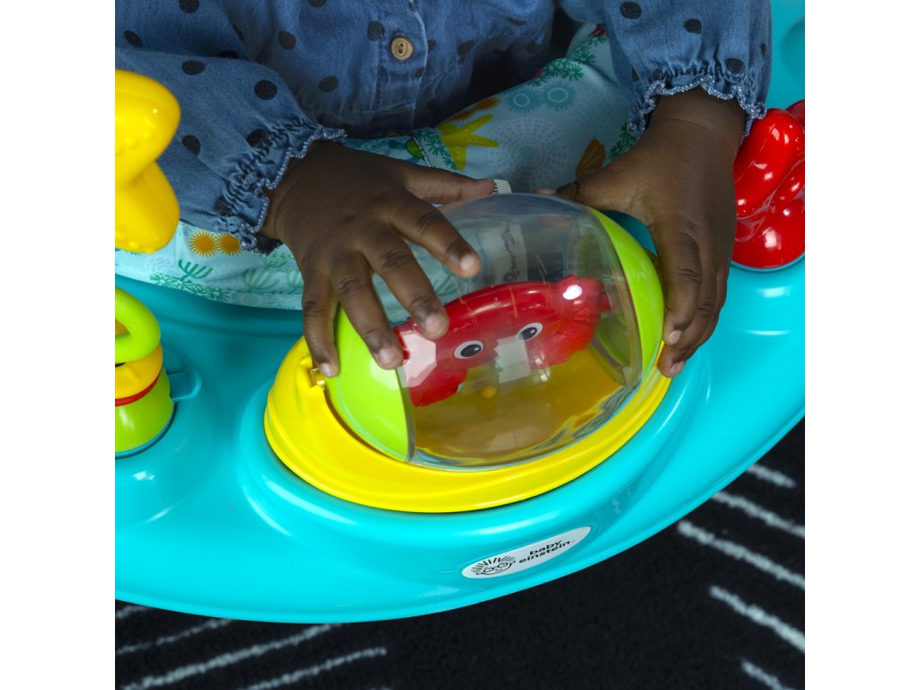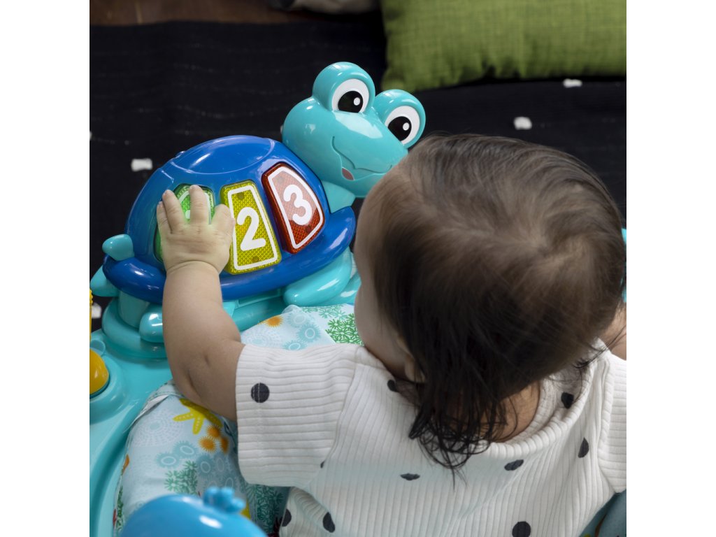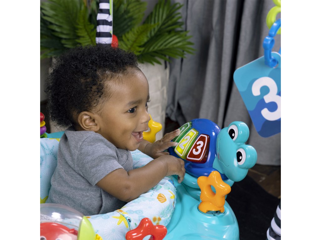 Podporte more učenia so skákadlom 2v1 Baby Einstein Ocean Explorers Curiosity Cove. S otočným sedadlom o 360 stupňov môže bábätko objavovať pohľady a zvuky oceánu zo všetkých strán, zatiaľ čo skáče, skúma a hrá sa s týmto skákadlom s motívom oceánu a odnímateľnou hračkou. Tri herné režimy pomáhajú bábätku objavovať melódie, stimulujú zmysly a učia farby a čísla v 4 jazykoch – angličtine, francúzštine, nemčine a španielčine. Melódie a svetielka zapájajú bábätko počas skákania a elektronická hračka Neptune the Turtle (korytnačka Neptún) ponúka ďalšie učenie pri hre na zemi alebo na cestách. Štyri nastaviteľné výšky jednoducho prispôsobia skákadlo rastúcemu bábätku, čím mu poskytnú bezpečný priestor na objavovanie a hranie od 6 mesiacov do 1 roka alebo do 11,3 kg.