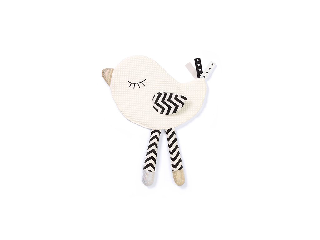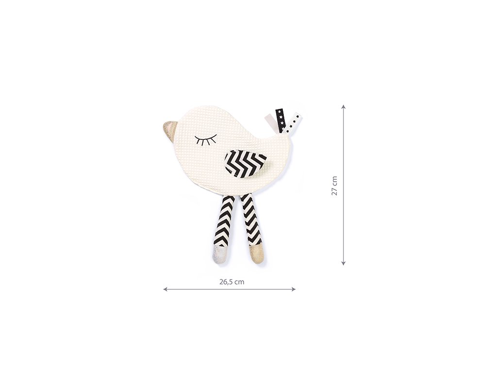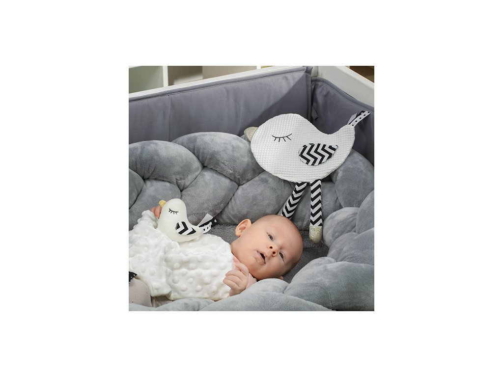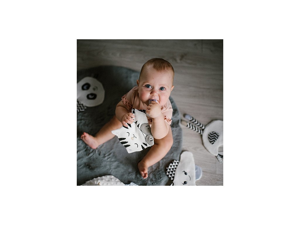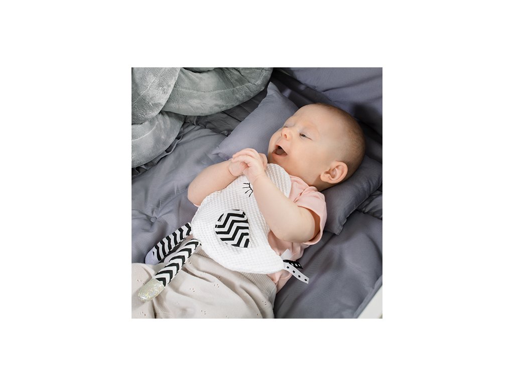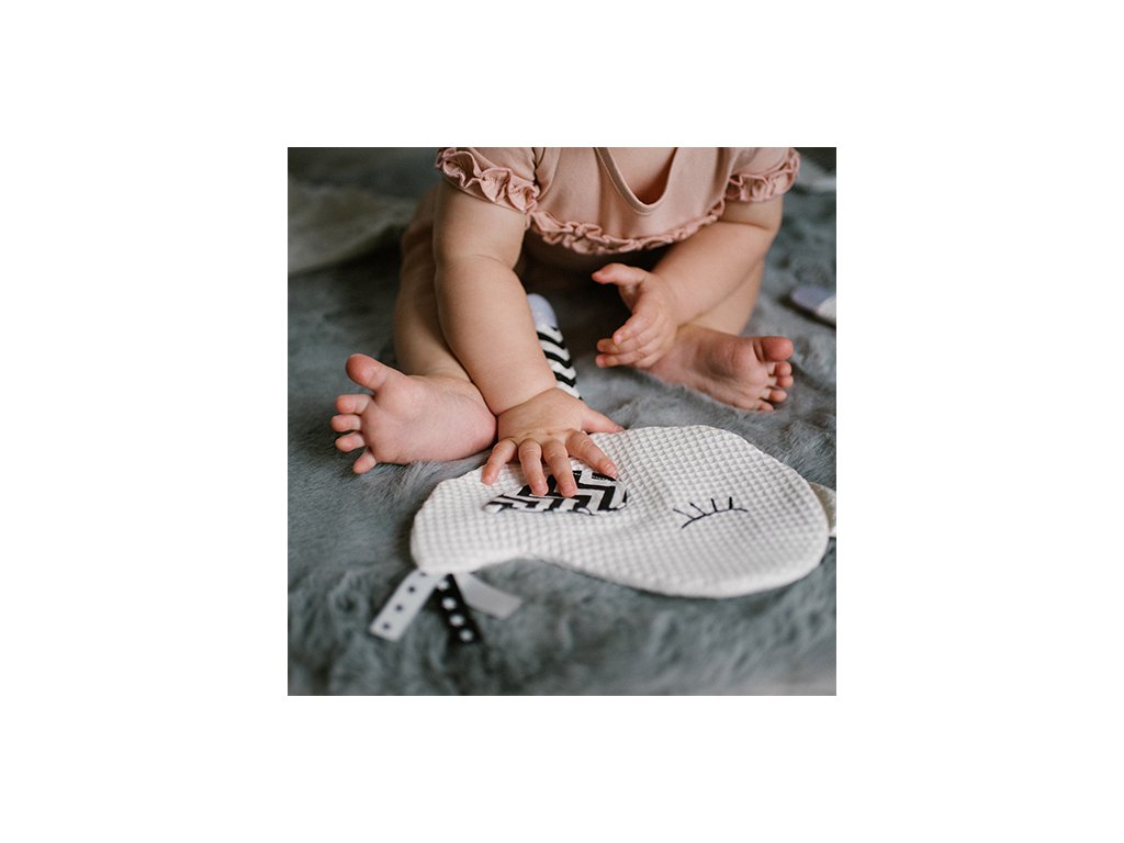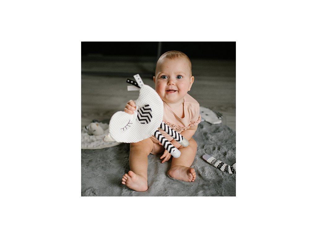 Tento plochý plyšák obsahuje prvky v kontrastných farbách. Počas prvých 3 mesiacov svojho života vidí novorodenec čierno-bielo. Takéto farby hračky priťahujú zrak dieťaťa. Pomáhajú sústrediť sa a upútať pozornosť.