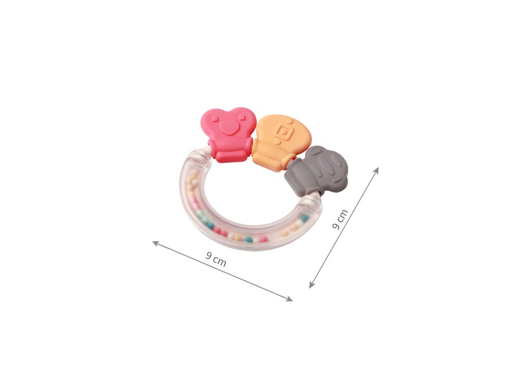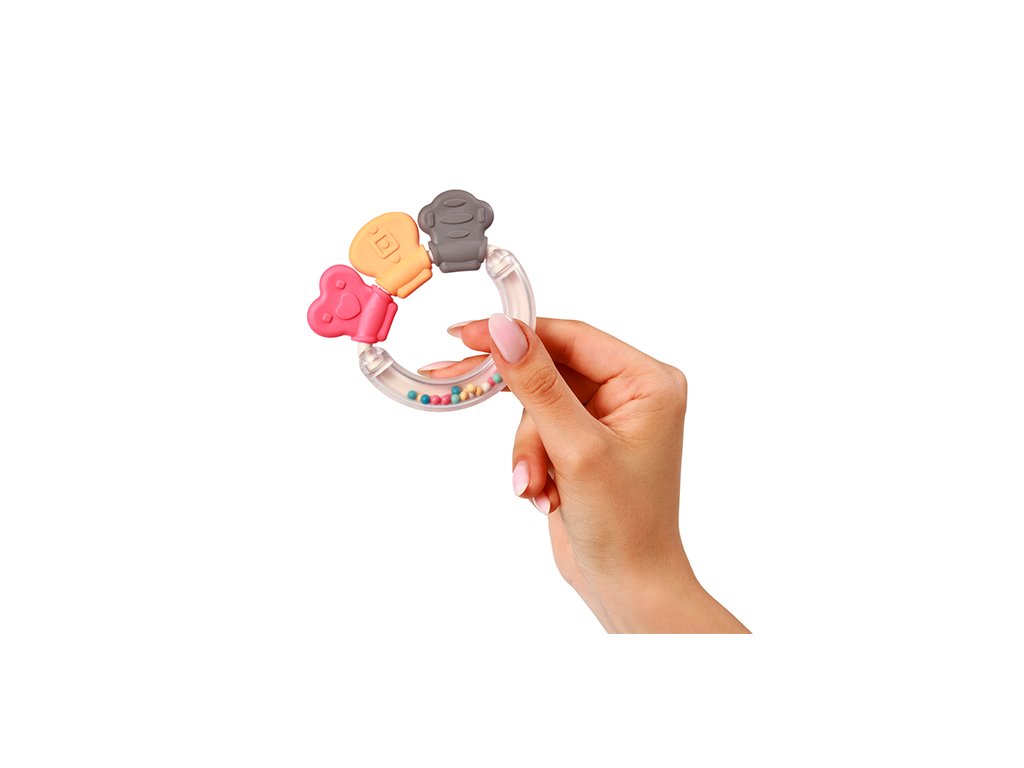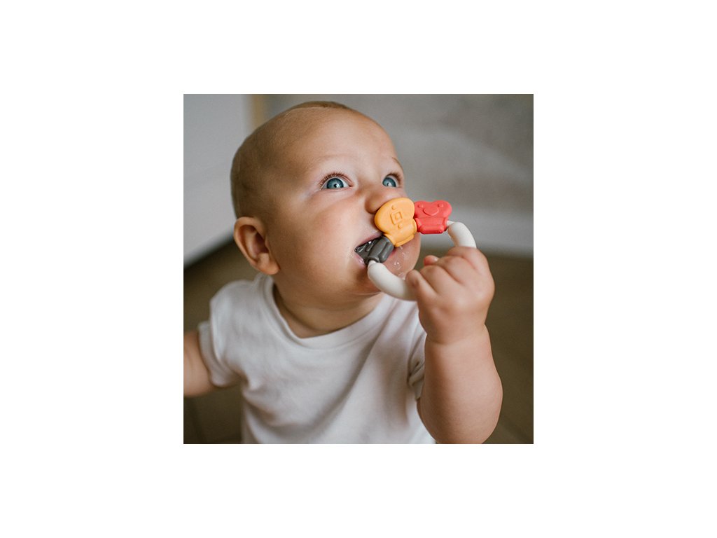 - Príjemná silikónová hryzačka jemne masíruje ďasná bábätka a poskytuje úľavu počas obdobia prerezávania zúbkov.