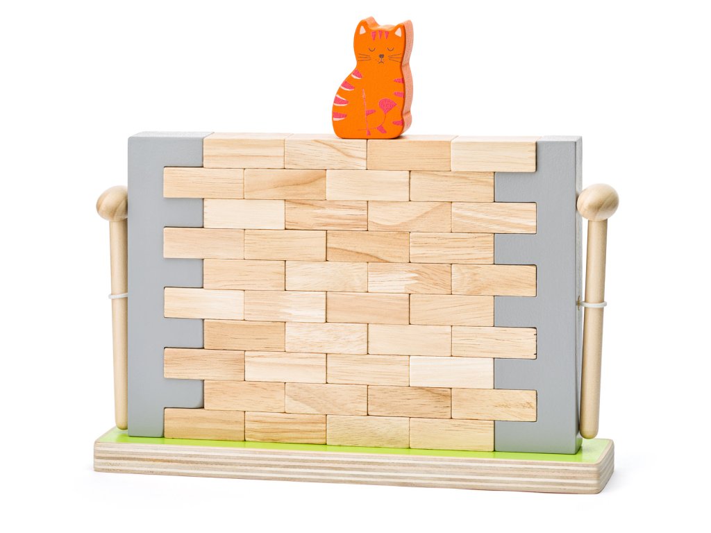 Úlohou dieťaťa je postaviť múr a posadiť naň mačku. Potom, čo je stena postavená, môže hra začať. Každý z hráčov si vezme do ruky kladivko a vyťukne jednu tehličku zo steny tak, aby stena stále držala pohromade a mačka sediaca na nej nespadla. Komu prvá mačka zo steny spadne, prehráva. Hra je určená pre 2 hráčov, z ktorých môže byť jeden rodič a druhý dieťa. Vek:3+| Rozmer: 25,8x5x16,5 cm
