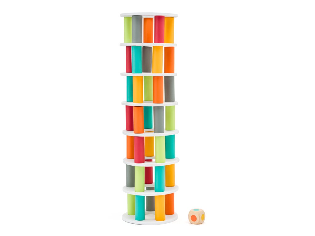 Úlohou dieťaťa je postaviť vežu z valčekov a krúžkov tak, ako ju vidia na obrázku. Potom môže hra začať. Každý z hráčov postupne vyťahuje valčeky z veže tak, aby veža stále držala pohromade. Komu prvému veža spadne, prehráva. Hra je určená pre 2 hráčov, z ktorých môže byť jeden rodič a druhý dieťa.| Vek:3+ | Rozmer balenia: 18x11,3x5,3 cm