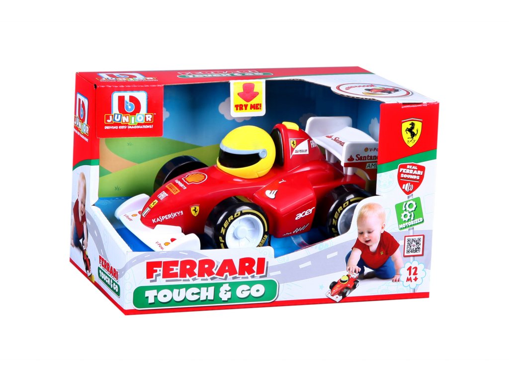Formula Ferrari F2012 so zvukmi BBJunior z radu Touch & Go. Po stlačení tlačidla sa jasne červená formula Ferrari rozbehne a svojim realistickým zvukom motora rozžiari detské oči. Toto športové auto pomáha trénovať motorické schopnosti a stimulovať sluchové zmysly detí. Autíčko je vhodné pre deti od 12 mesiacov. Napájanie autíčka je na dve batérie AAA, ktoré sú súčasťou balenia. Veľkosť autíčka je 5,2 ´´(13,2 cm). Rozmer balenia: 17,78 x 17,15 x 10,8 cm.