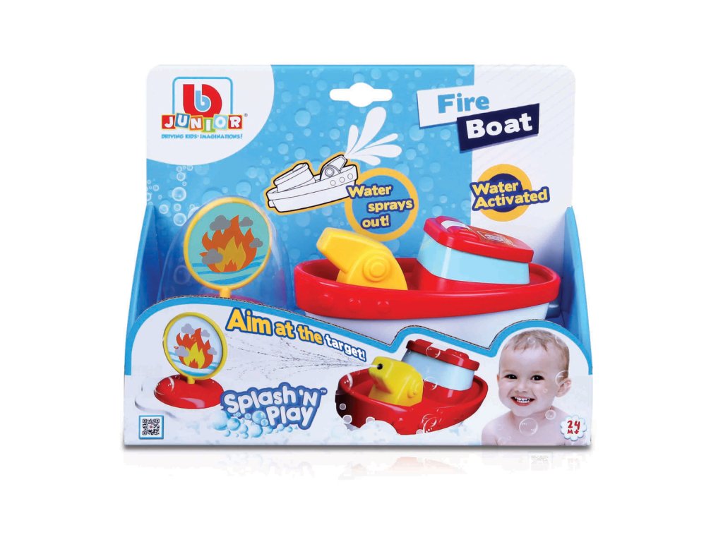 Hasičský čln BBJunior z radu Splash'N Play. Jednoducho umiestnite čln do vody vane alebo bazéna a motor automaticky aktivuje požiarnu hadicu tryskajúcu vodu, ktorá je namontovaná na palube. Hasičský čln je pripravený chrániť vodné cesty pred akýmikoľvek horiacimi predmetmi, ako je priložená plávajúca bója. Stačí zamieriť na svoj cieľ a uhasiť oheň. Podporuje rozvoj koordinácia ruka/oko. Vyučuje deti predstieranú hru a princíp príčiny a následku. Hračka je vhodná pre deti od 24 mesiacov. Napájanie člna je na dve batérie AAA, ktoré nie sú súčasťou balenia. Veľkosť člna je 5,9“ (14,98 cm) Rozmer balenia: 17,78 x 24,13 x 12,07 cm.