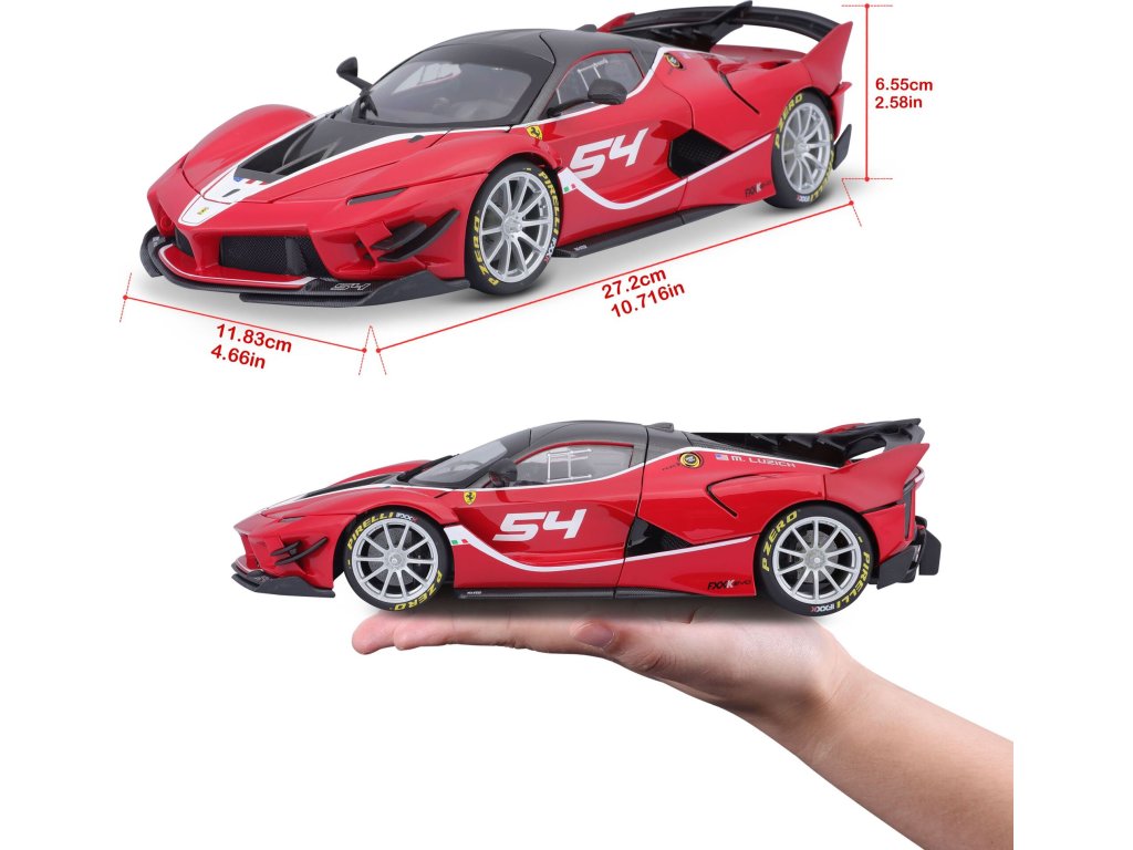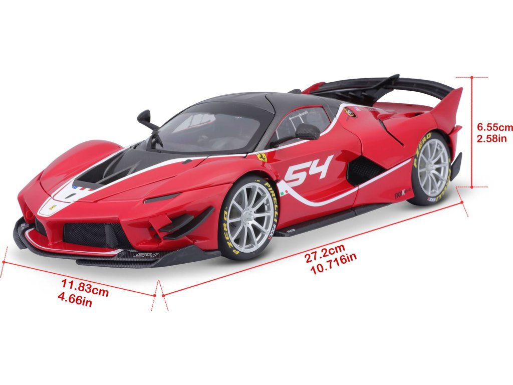 Bburago 1:18 Ferrari Sing FXX-K EVO No.54 (red) Model auta v mierke 1:18 vyrobený z kovových a plastových dielov.Balené v uzavretej papierovej krabičke, auto uložené v polystyrénovom výlisku.Hore výklopné dvere, otváracia predná a zadná kapota , natáčacie a odpružená kolieska.Dĺžka modelu cca 27 cm.
