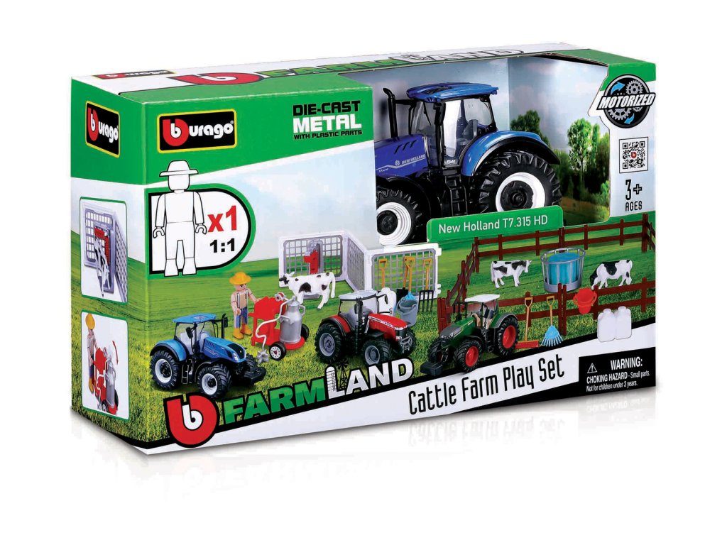 Herná sada Farma s traktorom z kolekcie Farmland prináša deťom nekonečné hodiny zábavy. Súprava obsahuje model traktora, ohradu, figúrku panáčika, figúrky kravičiek a veľa príslušenstva. Figúrky, ohrada a príslušenstvo sú vyrobené z plastu. Traktory z kolekcie Farmland sú zbierkou modelov s vysokým dôrazom na presnosť detailov. Modely traktorov sú vybavené zotrvačníkom a sú vyrobené z liateho kovu s plastovými detailmi. Assort je náhodný mix modelov. Výber nie je možné ovplyvniť. Súpravy môžu obsahovať rôzne modely traktorov. Modely v assore: New Holland T7.315 HD, Fendt 1050 Vario, Massey Ferguson 8740S. Balené v krabičke. Nevhodné pre deti do 3 rokov. Rozmery balenia: 15 x 24,5 x 9 cm. Vek: 3+