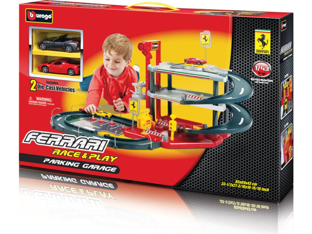 Bburago Ferrari Parking Garage s dvoma autíčkami 31204, výrobca BBurago. Trojposchodová garáž s príslušenstvom: funkčný výťahs množstvom príslušenstvas mechanicky pohyblivými časťami: zdvíhacia plošina, pohyblivá umyvárka, rampa...súčasťou sú dva kovové modely Ferrari 1:43 Pre deti od 3 rokov