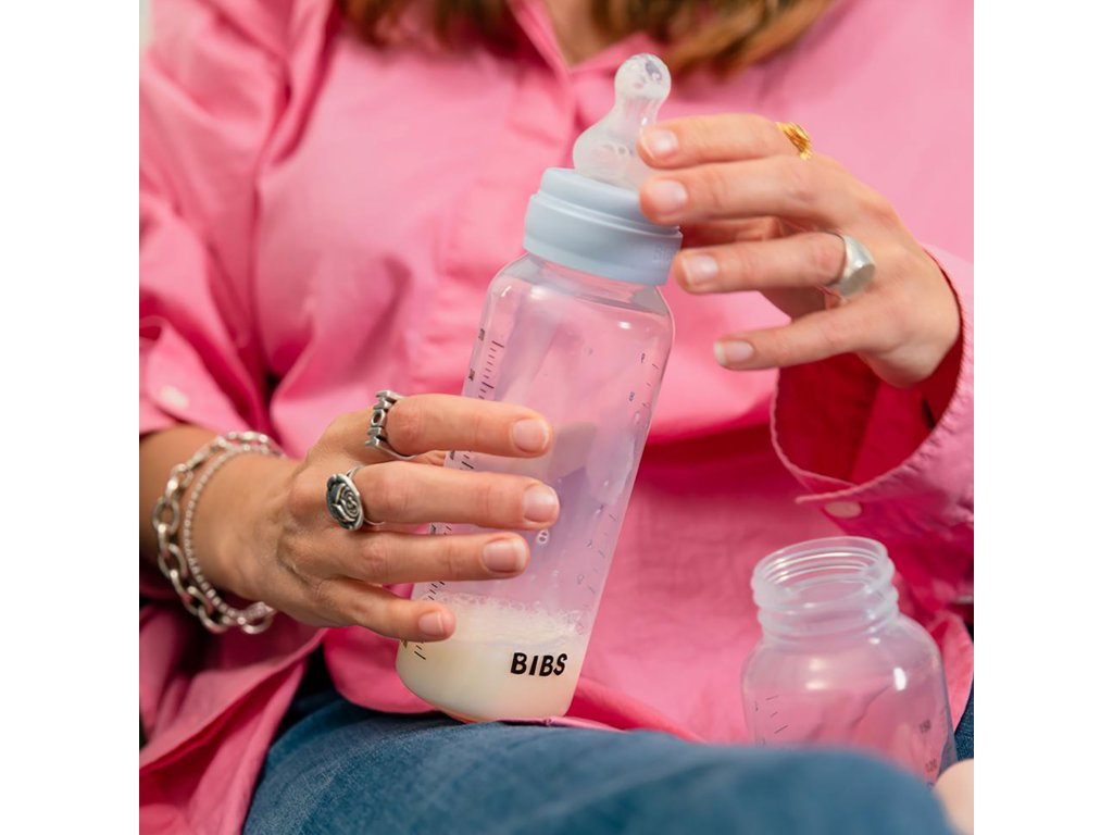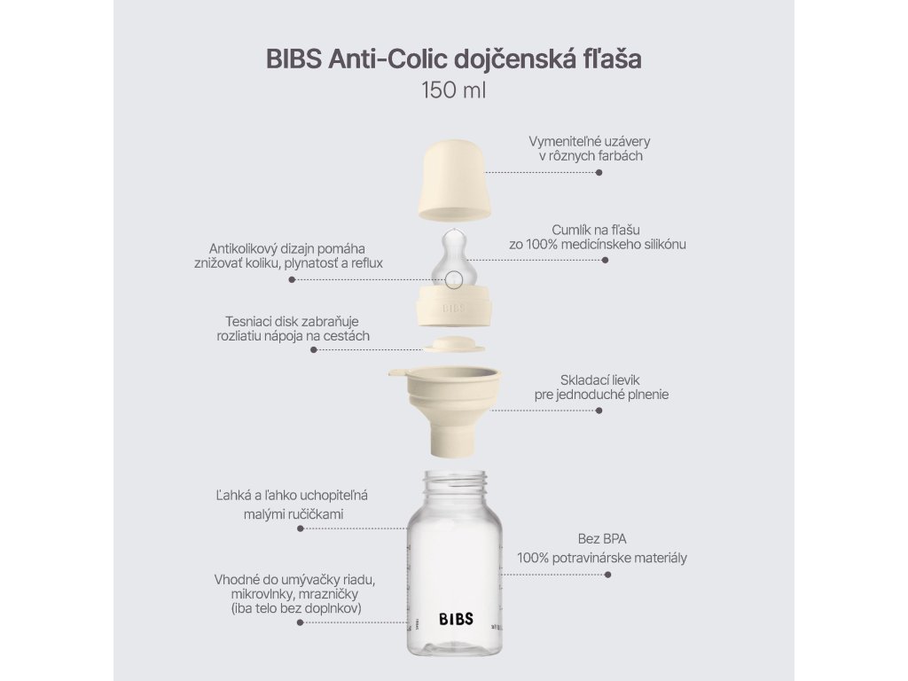 BIBS je obľúbená dánska značka s tradíciou výroby ikonických cumlíkov od roku 1978. Okrem cumlíkov BIBS ponúka aj pestrý prémiový sortiment pre najmenšie deti v minimalistickom škandinávskom dizajne a širokej farebnej palete. Výhodné balenie dvoch BIBS antikolikových dojčenských fliaš a náhradných cumlíkov udrží krok s meniacimi sa potrebami vášho dieťatka a jeho rastúcim apetítom. Praktický darček pre budúcu alebo čerstvú mamičku. Obľúbená fľaša s elegantným dizajnom oceneným Red Dot Design Award. 2 fľaše z potravinárskeho PP bez obsahu BPA a ftalátov - 150ml a 270ml s doplnkami. 4 cumlíky z hypoalergénneho silikónu rôznych prietokov - pomalý prietok (150ml fľaša), stredný prietok (270ml fľaša) a 2 x rýchly prietok (náhradné balenie cumlíkov). Anti-Colic dizajn – unikátny antikolikový ventil v tvare srdiečka pomáha predchádzať plynatosti, refluxu a kolike a podporuje plynulý tok mlieka pre šťastnejšie brušká. Obľúbený okrúhly tvar cumlíka pripomína tvar matkinej bradavky, podporuje podobné umiestnenie jazyka a správnu aktívnu techniku satia ako pri dojčení a tým uľahčuje striedanie dojčenia z prsníka a kŕmenia z fľaše. Mäkký cumlík z hypoalergénneho silikónu medicínskej kvality, s vystuženým rebrovaním pre väčšiu odolnosť a protišmykovou textúrou pre pevné prisatie. Praktické doplnky súčasťou balenia (skladací lievik, 2x tesniaci disk). Jednoduché čistenie - vhodné aj do umývačky riadu, mikrovlnnej rúry, mrazničky (okrem cumlíka a lievika). Vysoká kvalita – všetky komponenty sú vyrobené v Európe zo 100% potravinárskych materiálov bez BPA a iných škodlivín. 100% recyklovateľné. OBSAH BALENIA: 1x BIBS antikoliková dojčenská fľaša so silikónovým cumlíkom 150 ml (pomalý prietok)*. 1x BIBS antikoliková dojčenská fľaša so silikónovým cumlíkom 270 ml (stredný prietok)*. 1x BIBS antikolikové silikónové cumlíky (2x rýchly prietok). 1x skladací lievik pre rýchle a jednoduché naplnenie fľaše. *Súčasťou každej fľaše je cumlík, vrchnák, objímka a tesniaci disk. MIX&MATCH: Okrem kompletnej dojčenskej fľaše, ktorá vám poskytne všetko, čo potrebujete na pohodlné kŕmenie z fľaše (fľaša, cumlík, objímka, vrchnák, tesniaci disk a lievik), je v ponuke aj samostatná náhradná fľaša (150 ml alebo 270 ml) a samostatný set uzáverov na fľašu (objímka, vrchnák a tesniaci disk v rôznych farbách). Môžete si tak vyskladať fľašu podľa potrieb vášho dieťatka a vašich preferencií. BIBS ponúka samozrejme aj náhradné cumlíky v kaučukovom aj silikónovom prevedení, s rôznymi prietokmi (pomalý, stredný, rýchly). POUŽITIE: Pred prvým použitím sterilizujte všetky súčasti fľaše vo vriacej vode po dobu 5 minút, neskôr sterilizujte podľa potreby. Pravidelne kontrolujte cumlíky a podľa potreby ich vymeňte (cca každé 2-3 mesiace v prípade silikónu), alebo skôr, ak sú poškodené. Všetky komponenty fľaše, okrem lievika a cumlíka, sú vhodné do umývačky riadu v hornom koši. Pri čistení cumlíka nepoužívajte ostré predmety. BIBS fľaše spĺňajú európsku normu EN 14350:2020.