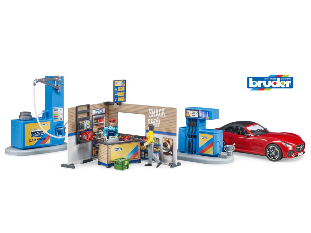 Bworld, to je herný svet BRUDER. Skladá sa z pohybujúcich sa figúrok, zvierat, doplnkov, tematických sád a je zaradený do známych kategórií BRUDER. Či už ako vodič, jazdec, obsluha čerpacej stanice, lekár na ošetrovni alebo servis v motocyklovej dielni, sady z Bworld ponúkajú veľa zábavy a sú ideálnym rozšírením sveta vozidiel. Všetky vozidlá potrebujú tankovať a občas aj umyť. K tomu slúži nová, skvele vybavená čerpacia stanica Bworld. Na čerpacej stanici sú k dispozícii všetky bežné druhy paliva vrátane nabíjacej stanice pre e-vozidlá. Obsluha čerpacej stanice pracuje v modernej predajni s monitorom a pokladničným systémom. Na čistenie vozidiel je tu pripravená plne funkčná umývačka. Vodu naplníte do integrovanej nádrže. Tlak sa zvyšuje pomocou vstavanej ručnej vzduchovej pumpy a čistenie vodou je možné spustiť/vypnúť vypínačom. BRUDER Roadster s odnímateľnou strechou a systémom výmeny kolies vrátane figúrky zákazníka dopĺňajú túto úžasnú sadu. Hračka nie je vhodná pre deti mladšie ako 3 roky. Vhodné pre hru vnútri aj vonku. Mierka: 1:16. Rozmer balenia: 19,5 x 26 x 56,5 cm. Vek: 4+