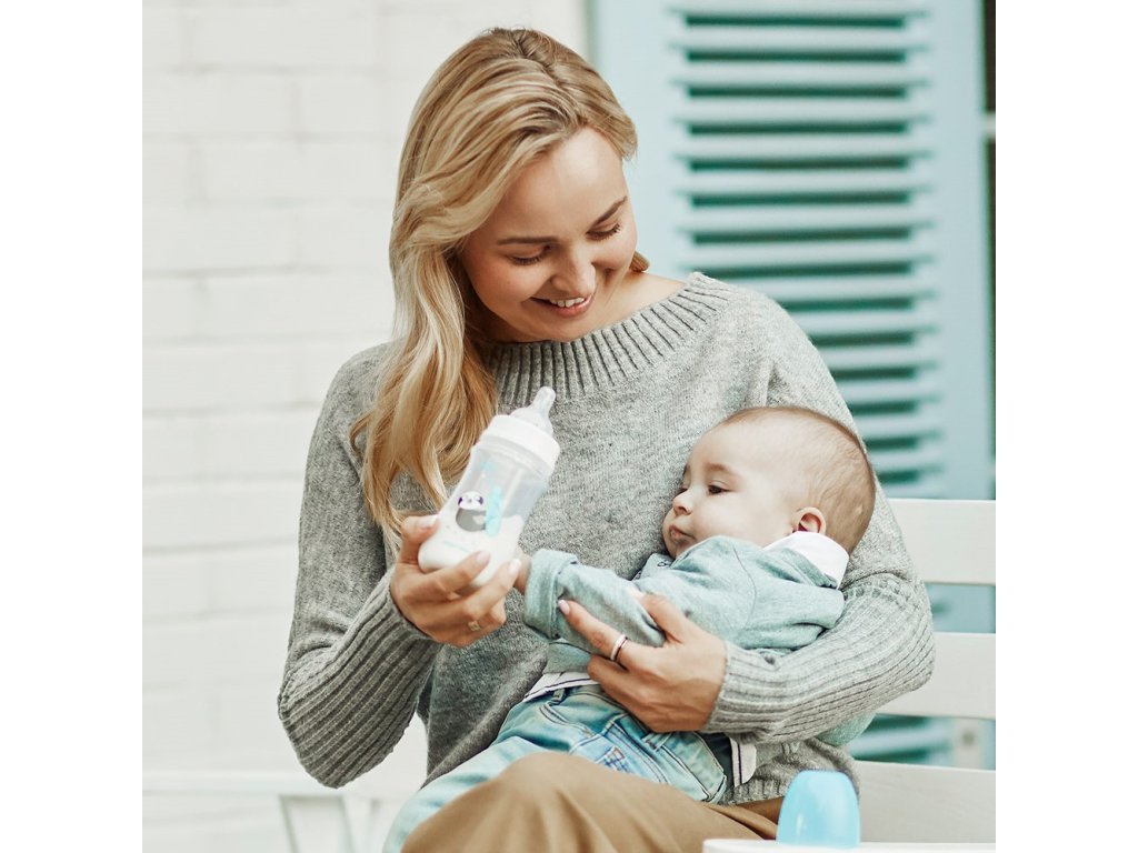 Antikoliková fľaša EasyStart. Pred prvým a každým ďalším použitím fľašu a všetky jej časti dôkladne umyte a vydezinfikujte. Z hygienických dôvodov sterilizujte vo vriacej vode asi 5 minút. Umývajte pred každým použitím. Dlhé vyváranie a tvrdá voda môžu spôsobiť usadeniny. Všetky časti dôkladne umyte čistou vodou, vrátane oblastí, ktoré môžu byť neviditeľné, ale mohlo nimi prejsť jedlo, aby ste odstránili všetky zvyšky jedla. Po použití vyčistite fľaštičku s cumlíkom od zvyškov jedla, opláchnite, umyte a potom dezinfikujte v parnom / elektrickom sterilizátore alebo vriacej vode. Fľaša sa môže umývať v umývačke riadu (max. teplota 65°C). Neodporúča sa umývať cumlík v umývačke riadu, pretože čistiace prostriedky môžu cumlík poškodiť. Nepoužívajte žiadne antibakteriálne prípravky! Kvalitu cumlíka vyskúšajte dôkladným natiahnutím všetkými smermi. Cumlík starostlivo skontrolujte, najmä ak má vaše dieťa zuby. Pri prvých známkach opotrebovania alebo poškodenia už výrobok ďalej nepoužívajte – vymeňte ho za nový. Neuťahujte viečko s cumlíkom príliš silno, mohlo by dôjsť k zlému odvzdušňovaniu. Skontrolujte, či z uzáveru neuniká žiadne jedlo. Nedierujte a nezväčšujte otvory v cumlíku – môžete spôsobiť jej zničenie. Ohrievaniu v mikrovlnnej rúre venujte zvýšenú pozornosť. Vždy dôkladne premiešajte ohriaty pokrm a skontrolujte jeho teplotu pred podaním dieťaťu. Nezabudnite, že pri ohrievaní v mikrovlnnej rúre musí byť fľaša otvorená. Výrobok neumiestňujte do horúcej rúry ani ho nezahrievajte v plynovom či elektrickom sporáku. Nenechávajte cumlík na priamom slnku, v blízkosti tepelného zdroja alebo v sterilizačných prostriedkoch dlhšie, než je odporúčané, môžete spôsobiť jej oslabenie. Z hygienických a bezpečnostných dôvodov a z dôvodu meniacich sa potrieb dieťaťa na prietok cumlíka odporúčame výmenu každé 2 mesiace. Fľaša je vyrobená z polypropylénu. Pre bezpečnosť a zdravie Vášho dieťaťa.