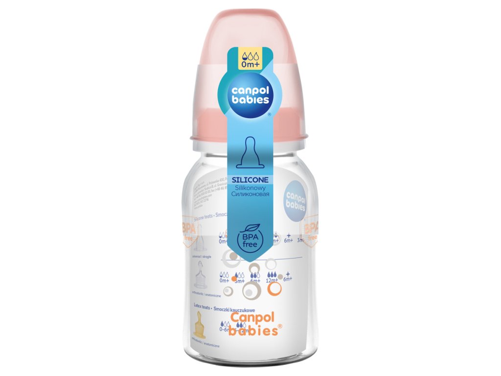 Fľaša s úzkym hrdlom z bezpečného polypropylénu. Je ľahká, priehľadná, má prispôsobený tvar a stupnicu. Môže sa umývať v umývačke a ohrievať v mikrovlnnej rúre. Umožňuje kombinovať dojčenie a kŕmenie z fľaše. Fľaša má silikónový univerzálny cumlík 3m+. Objem 120 ml.