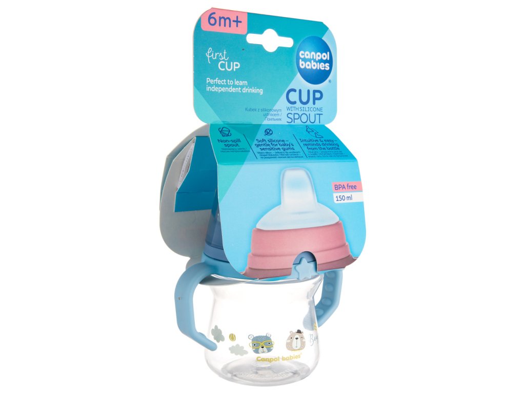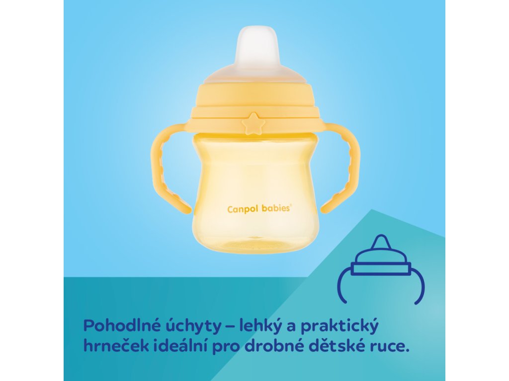 Výnimočne mäkký náustok je vyrobený z jemného silikónu, ktorý je bezpečný pre citlivé ďasná dieťaťa. Hrnček je ľahký a má ergonomickú profilovanú štruktúru. Pohodlné rukoväte uľahčujú držanie hrnčeka v malých detských ručičkách. Malý počet prvkov uľahčuje poskladanie a čistenie – hrnček nemá žiadne zbytočné zákutia, vďaka čomu je možné všetky časti rýchlo umyť. Silikónový náustok je možné tiež sterilizovať parou. Canpol babies netečúci hrnček so silikónovým náustkom v objeme 150 ml je priehľadný, čo umožňuje kontrolovať množstvo tekutiny prijímané dieťaťom.