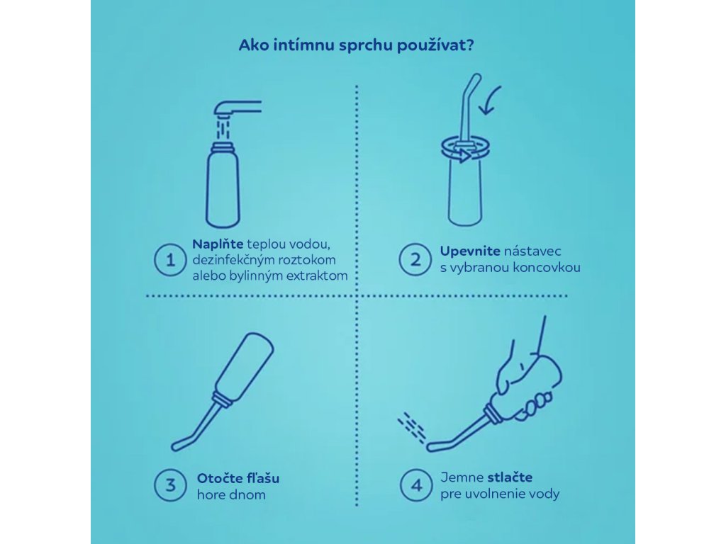 Intímna sprcha je navrhnutá tak, aby pravidelná intímna hygiena bola rýchla a jednoduchá, nech ste kdekoľvek: v nemocnici, doma alebo na cestách. Dlhý nástavec sprchy 17 cm a dve koncovky s rôznymi uhlami trysiek umožňujú lepšie prispôsobenie prúdu vody. Po obracaní fľaše smerom dole a jej stlačení vypustí sprcha prúd vody pod očakávaným uhlom, a tým sa ľahšie dostanete na ťažko dostupné intímne miesta. Uľahčuje očistenie ťažko dostupných partií bez toho, aby ste sa museli ohýbať. Zvlášť počas tehotenstva je spŕška veľmi užitočná, pretože brucho tehotnej ženy môže sťažiť pravidelné čistenie intímnych partií.