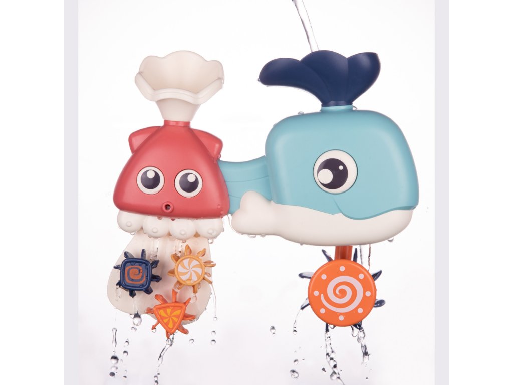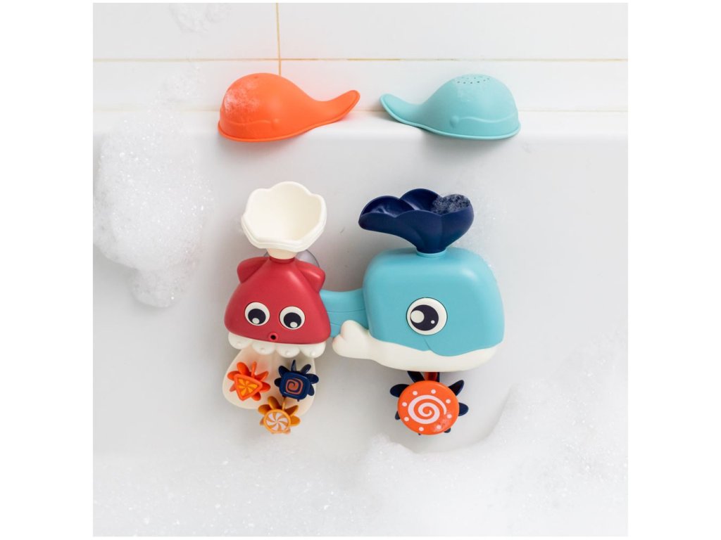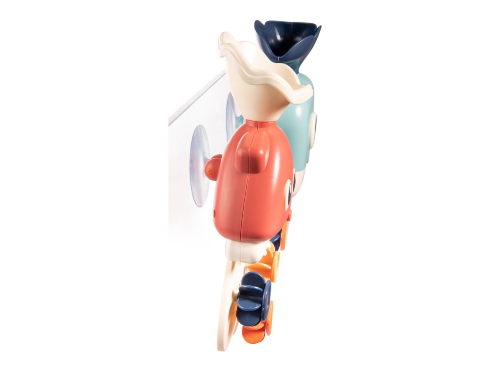 Kreatívna vodná hračka zaručuje veľa zábavy pri kúpaní. Otočné prvky, vodné mlyny, polievanie a lopatka poskytujú možnosť hrať sa mnohými spôsobmi. Pomocou lopatky nalejte vodu do otvorov v hornej časti hračky a sledujte, ako sa pohyblivé časti pohybujú pod vplyvom vody. Rôzne tvary a intenzívne farby zabávajú a učia, čím stimulujú psychomotorický vývoj dieťaťa. Hračka má praktické prísavky na upevnenie na stenu alebo na okraj vane. Určené pre deti staršie ako 18 mesiacov.