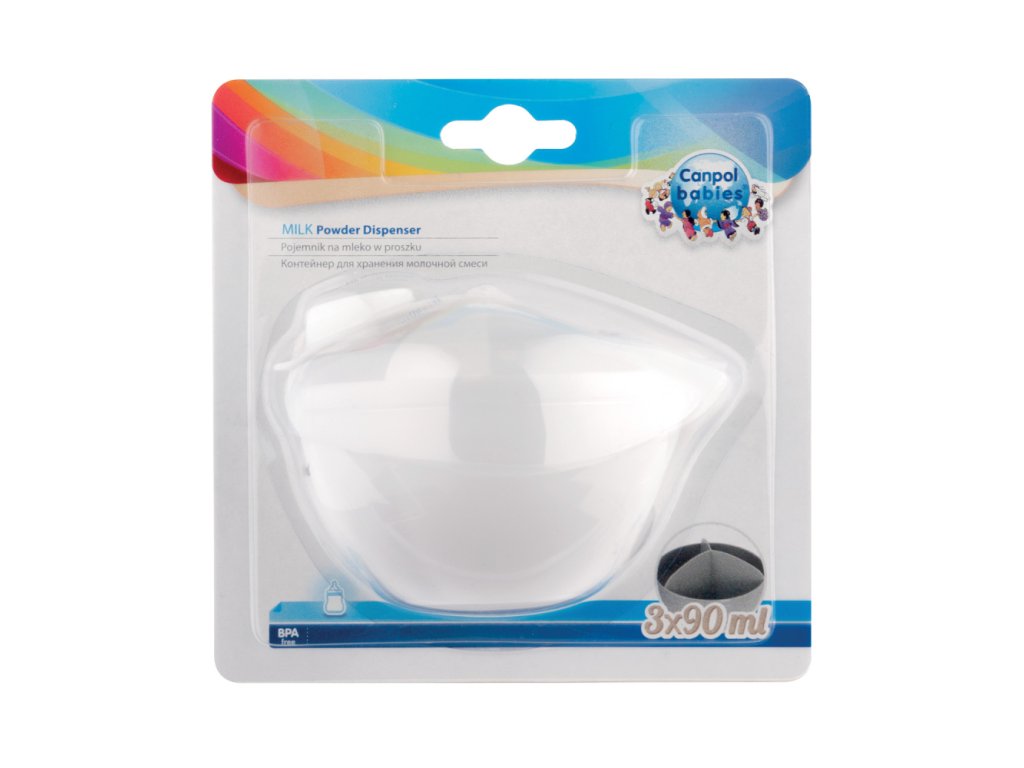Nádoba sa používa na pohodlné skladovanie sušeného mlieka. Má tri samostatné komory, takže umožňuje odmerať tri porcie sušeného mlieka na prípravu jedla pre dieťa. Nádoba je vhodná na používanie doma aj na cestách. Vhodné aj na skladovanie olovrantu pre dieťa. Objem každej komory je 90 ml – spolu 270 ml.