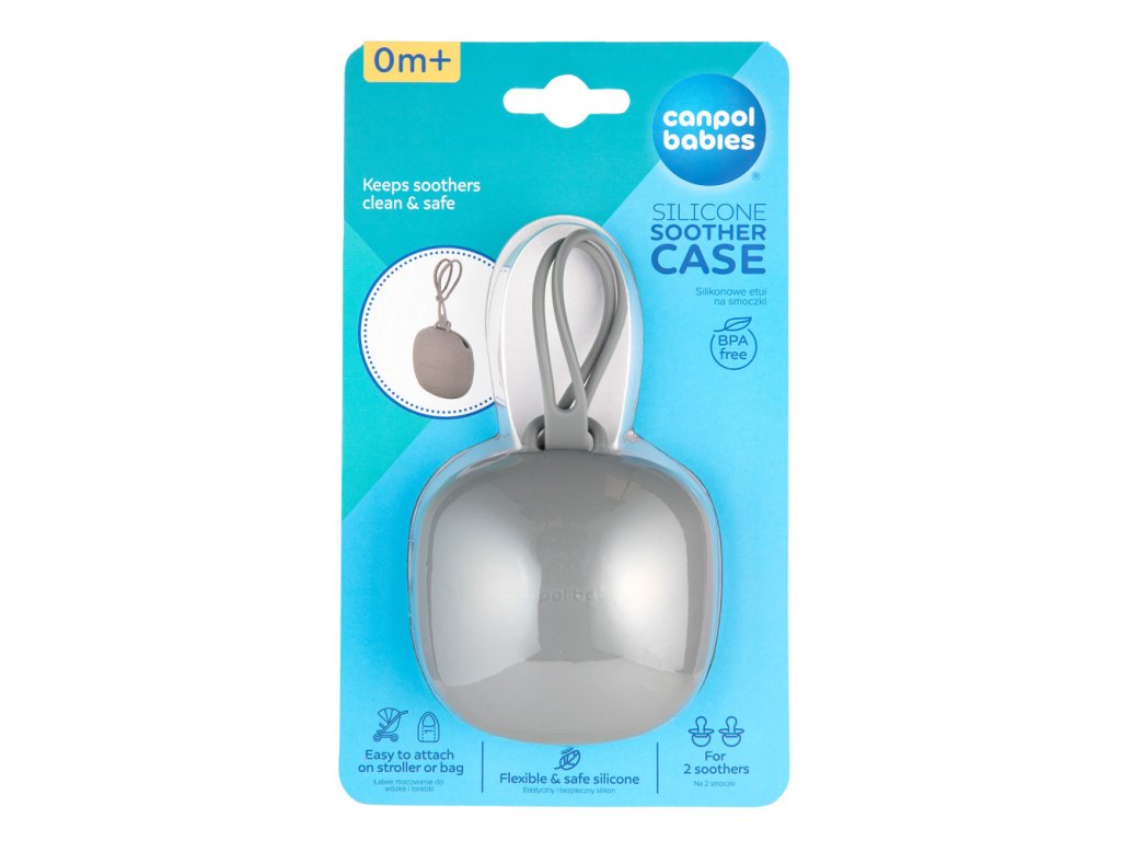 Silikónové puzdro na cumlík ochráni obľúbený cumlík vášho bábätka pri prechádzkach, cestovaní i doma. Krásny a praktický silikónový obal na cumlík pojme dva cumlíky štandardnej veľkosti, ktoré budú vždy čisté a pripravené na použitie. Puzdro má kompaktný tvar a pohodlnú praktickú rukoväť, pomocou ktorej ho je možné jednoducho pripevniť na kočiarik, postieľku alebo tašku, aby boli cumlíky vždy po ruke. Silikónové puzdro na cumlík Canpol babies je vyrobené z pružného a mäkkého silikónu, vďaka ktorému sa pohodlne používa a jednoducho sa čistí. Minimalistický design sa hodí do kabelky každej mamičky.
