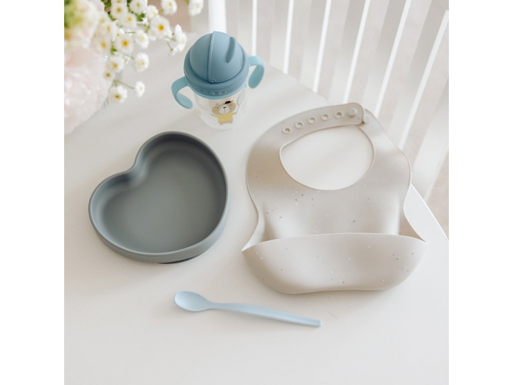 Vodeodolný silikónový podbradník s vreckom je nevyhnutný pri rozširovaní jedálnička vášho bábätka a pri prvých samostatných jedlách. Dokonale ochráni oblečenie vášho dieťaťa pred ušpinením a mokrom pri jedle. Je ľahký, mäkký, pružný a príjemný na dotyk. Podbradník je vyrobený zo 100% vysoko kvalitného potravinárskeho silikónu, vďaka čomu je bezpečný a bez zápachu. Praktické hlboké vrecko uchová zvyšky jedla, ktoré neskončili v ústach dieťaťa. Vrecko je navrhnuté tak, aby po naplnení jedlom zachovalo svoj tvar a dieťa ho pri pohybe alebo pritlačení náhodou nevysypalo. Podbradník sa ľahko čistí - môžete ho opláchnuť pod tečúcou vodou, utrieť alebo umývať v umývačke riadu.