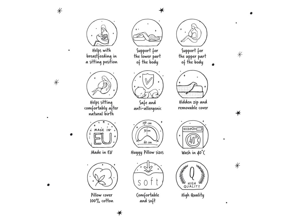 - Vankúš Huggy pomáha v čase odpočinku a pri spaní s veľkým bruškom. Keď už je dieťatko na svete, uľahčí kŕmenie, uľaví chrbtu a umožňuje zaujať pohodlnú pozíciu pri dojčení.