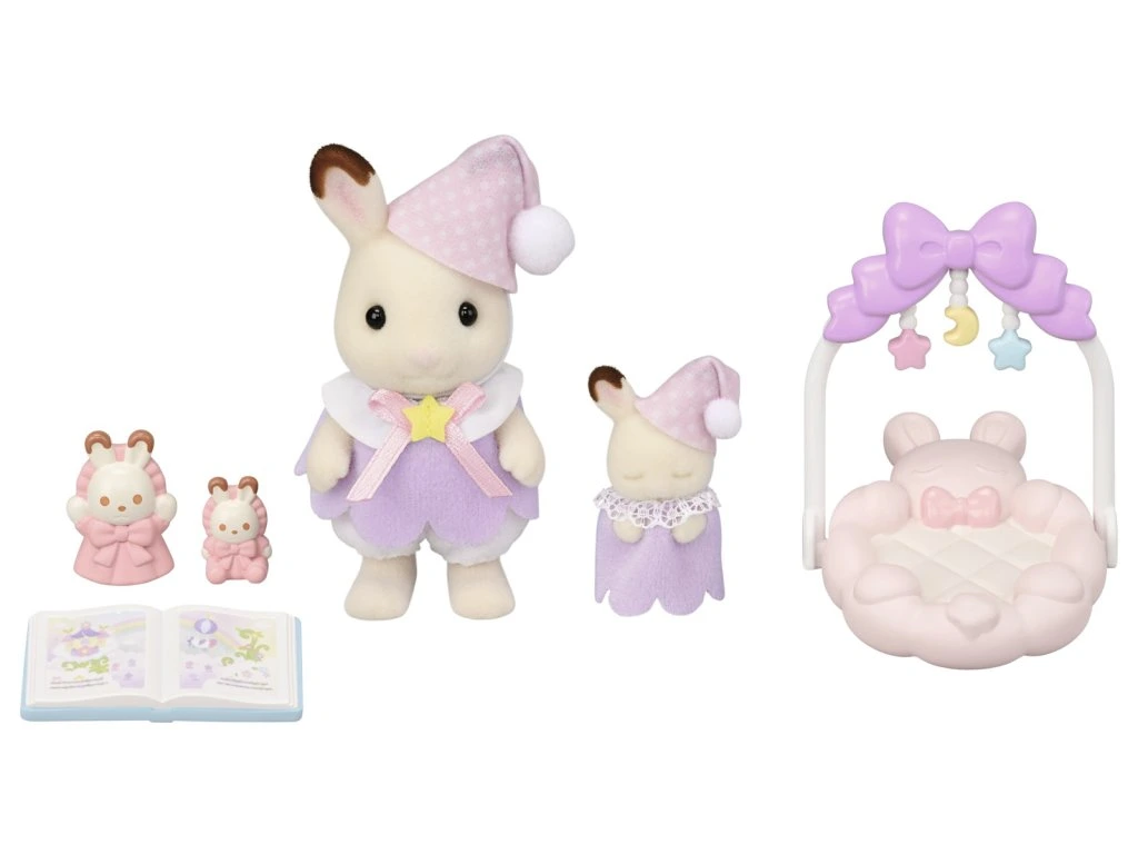 Súrodenci z rodiny čokoládových zajačikov zo Sylvanian Families sú pripravení ísť spinkať. Súprava obsahuje Freyu a jej malú sestru Floru. Malá Flora už má zatvorené oči a zdá sa jej sladký sen. Figúrky majú na sebe krásne fialové pyžamá a nočné čiapočky. Súprava obsahuje dve plyšové hračky na spanie, knihu s rozprávkami a detskú postieľku s oblúčikom v tvare mašle a hračkami v tvare hviezd a mesiaca. Hračky Sylvanian Families rozvíjajú predstavivosť a povzbudzujú deti k hraniu rolí. Hra s figúrkami rozvíja kreativitu a učí emóciám vytváraním a rozprávaním príbehov založených na každodenných zážitkoch a pozorovaní sveta. Vyznačujú sa najvyššou kvalitou a výnimočným dôrazom na detaily. Figúrky Sylvanian Families sú pokryté mäkkým semišom a majú pohyblivé končatiny a hlavu. Balené v krabičke. Rozmery balenia: 13 x 14,6 x 4,5 cm. Vek: 3+