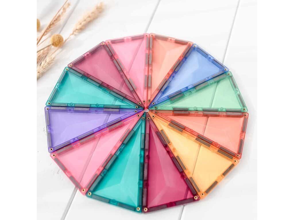Set obsahuje 8 pastelových šesťuholníkov, 16 rovnostranných trojuholníkov a 16 rovnoramenných trojuholníkov. Tieto diely sú ideálne na vytváranie rôznych tvarov a štruktúr, ktoré podporujú kreativitu a logické myslenie.