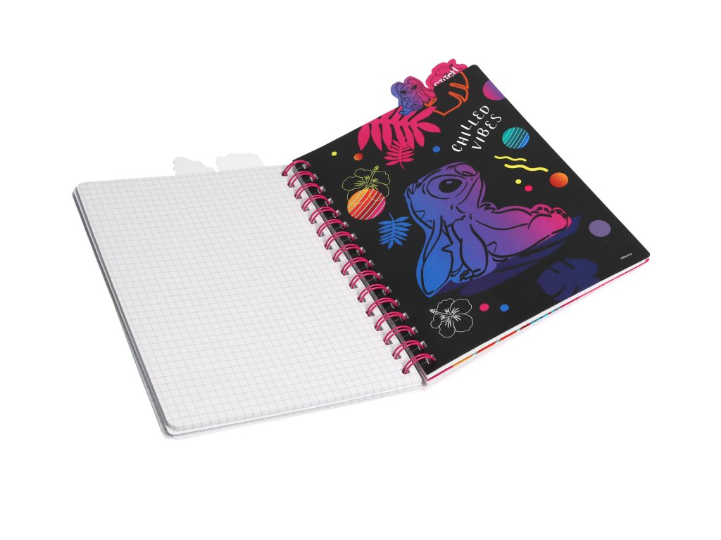 Zápisník špirálový Chill vibes A5 so záložkami Stitch Black Zápisník s dušou rozprávky Zápisník špirálový Chill vibes A5 so záložkami Stitch Black Stitch Pastel je dokonalý spoločník na každý deň – do školy, práce alebo na zapisovanie kreatívnych nápadov. Obsahuje 100 štvorčekových strán a záložky s Disney motívmi, ktoré dodajú tvojim poznámkam čaro. Kompaktný formát A5 sa zmestí do každej tašky, zatiaľ čo špirálová väzba a praktické záložky ti pomôžu udržať poriadok a prehľad. Dizajn inšpirovaný ikonickým Stitchom očarí každého milovníka Disney rozprávok.