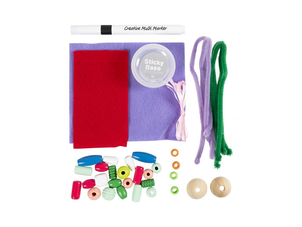 Lepiaca hmota, chlpaté drôtiky, drevené korálky, saténová stuha, plsť, plastové korálky a fix
