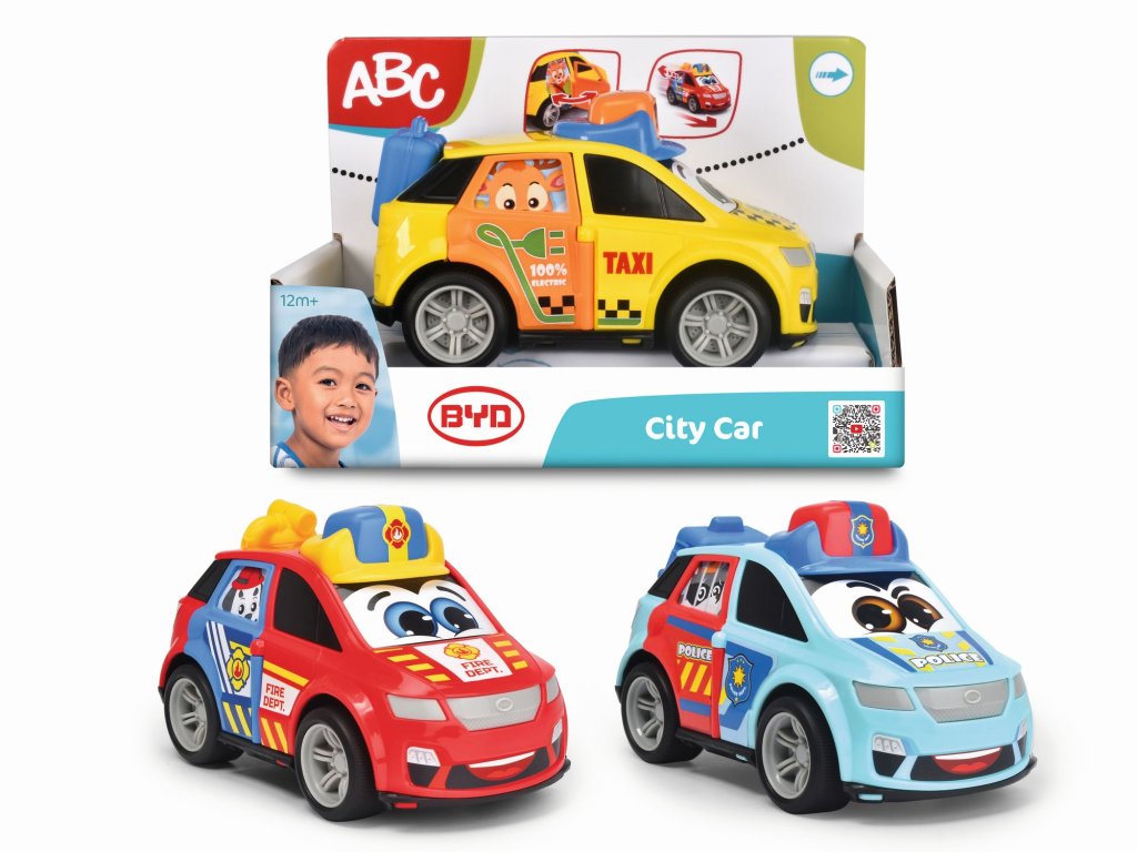 BYD mestské autíčko na spätný chod, s otváracími dverami, 3 druhy - hasiči, polícia a taxi. Dĺžka 14,5 cm.