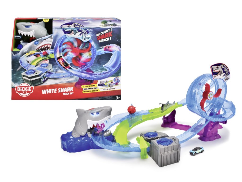 Autodráha White Shark s dĺžkou 80 cm. Motorizovaná žraločia dráha so slučkou. Svetelná aj zvuková funkcia - hrozivé podvodné zvuky, svetelné efekty a žraločí rev. Autá sa plnou rýchlosťou rútia slučkou, prechádzajú vodný tunel alebo pristávajú priamo u veľkého bieleho žraloka - ale pozor, môže kedykoľvek skúsnuť čeľuste. Turbo booster privádza vozidlá na najvyššiu rýchlosť. Súčasťou je kovové autíčko. Rozmery autodráhy: 50 x 55 x 32 cm.