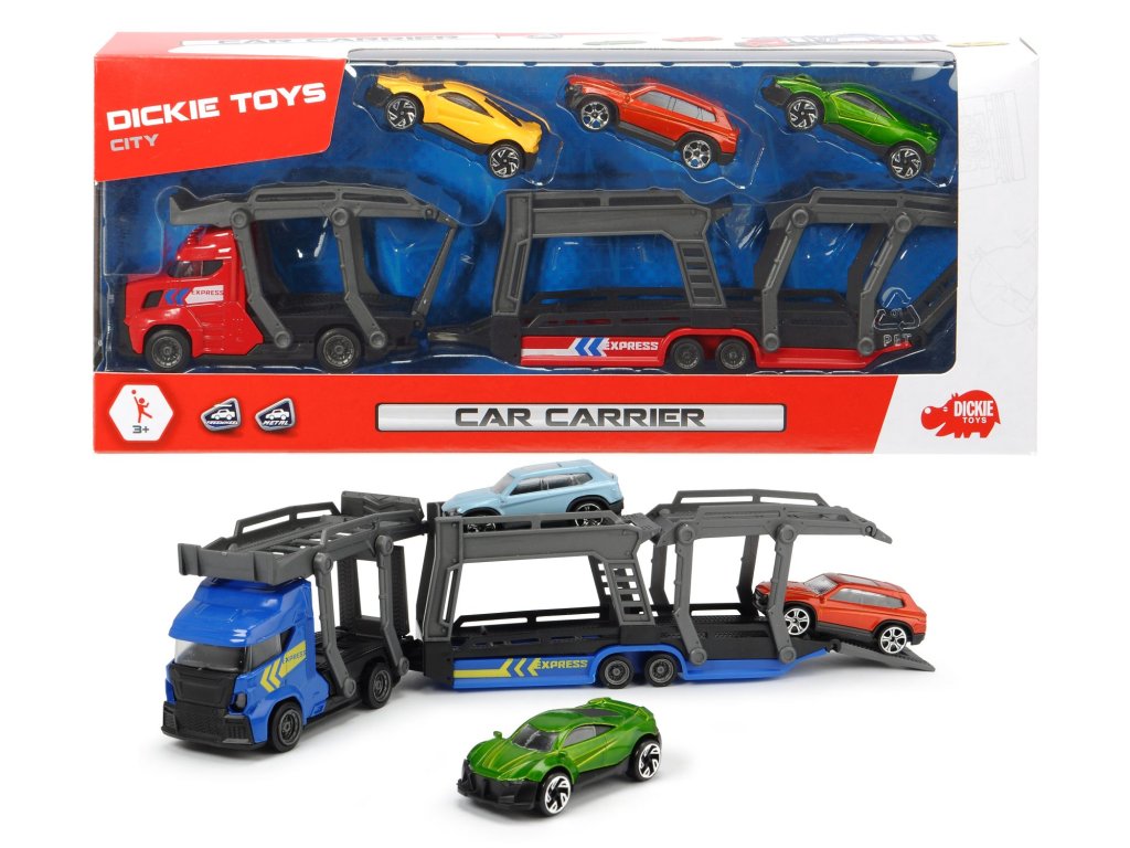Kovový auto transportér na voľnobeh, s pohyblivými časťami, vr. troch kovových autíčok. Dĺžka 28 cm.