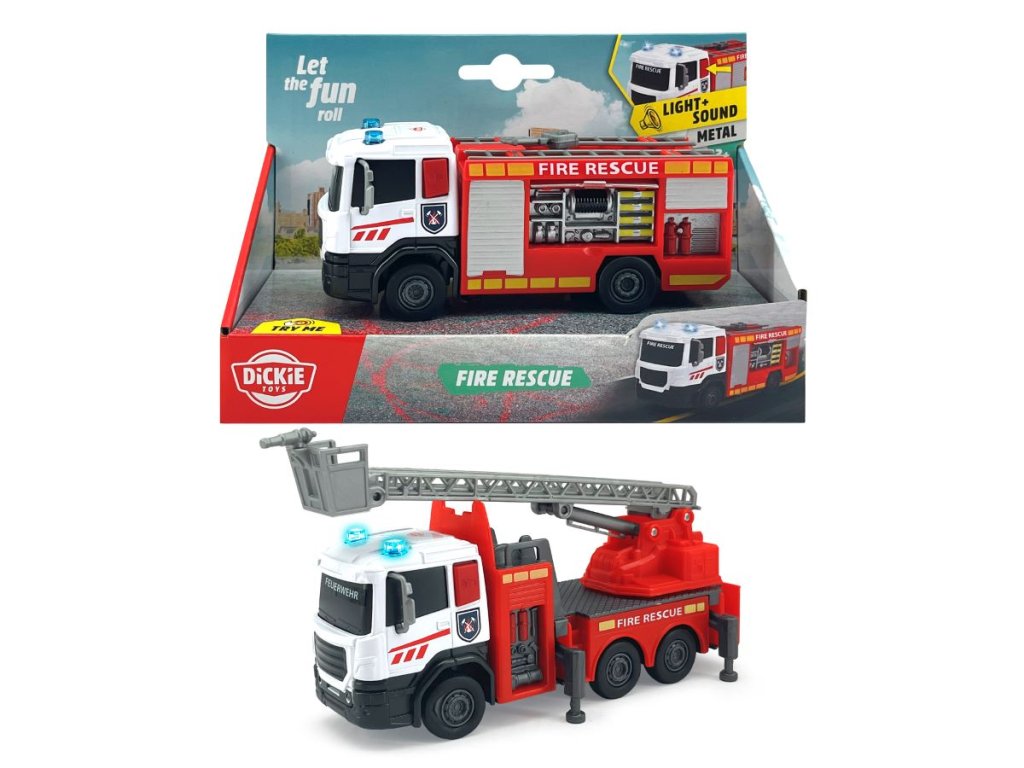 Hasičské auto na voľnobeh, svetelná a zvuková funkcia, kovová kabína, pohyblivé časti. Dĺžka 17 cm. 2 druhy: s otváracím bokom alebo s výsuvným rebríkom.