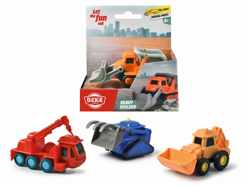 Stavebné autíčko na spätný chod, 4 druhy: vyklápač, bager, žeriav, buldozér. Veľkosť 10 cm.