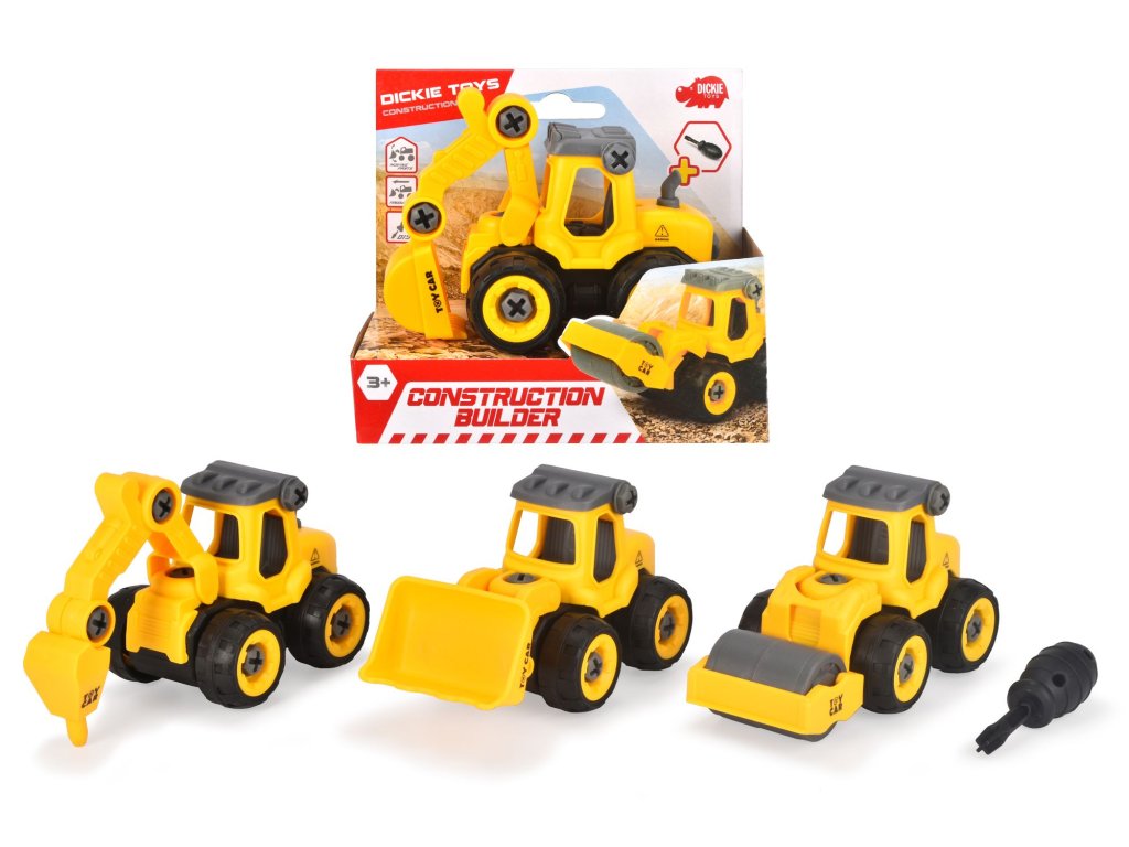 Žlté stavebné autíčko na voľnobeh, súčasťou je šraubovák. 4 druhy. Veľkosť 12,5 cm.