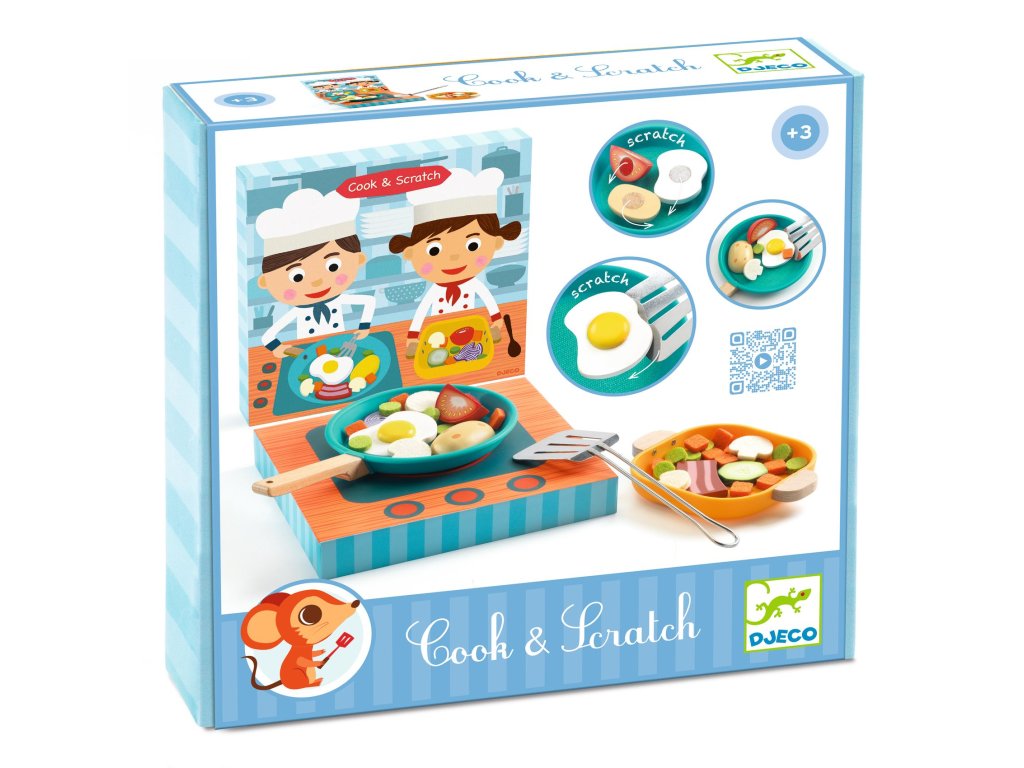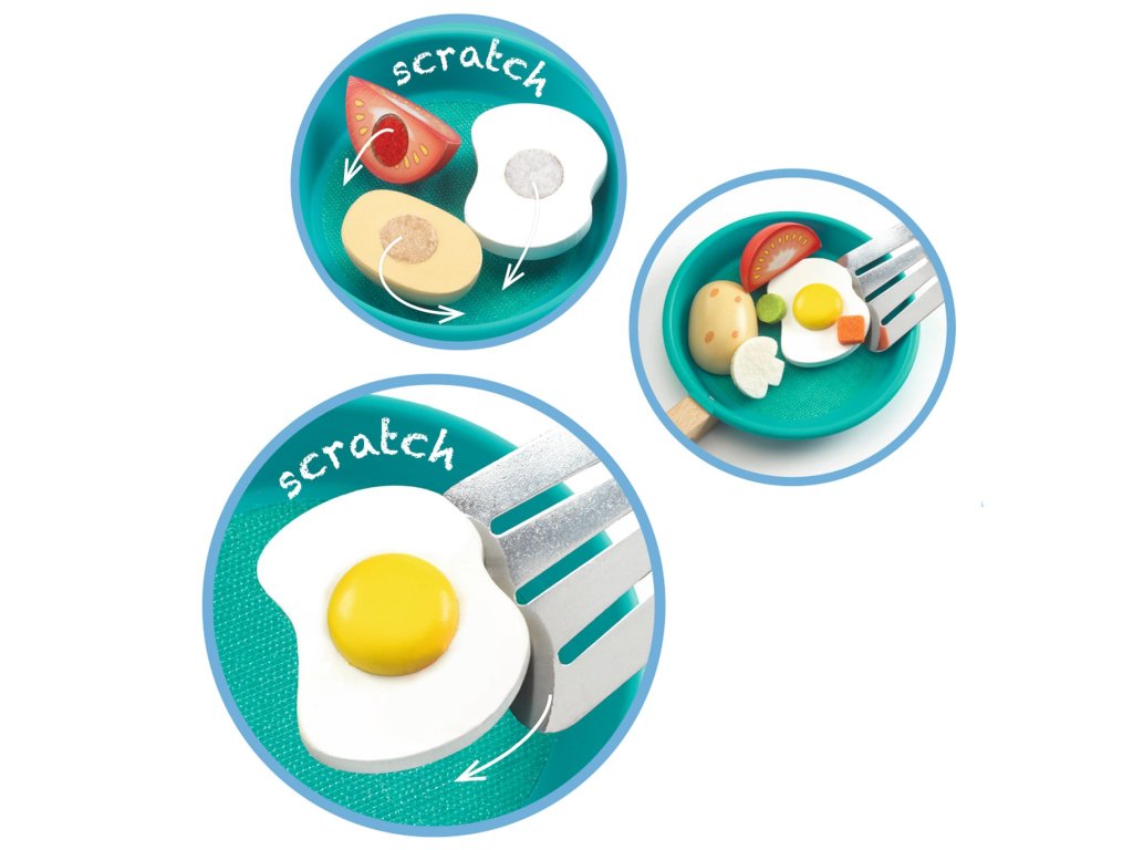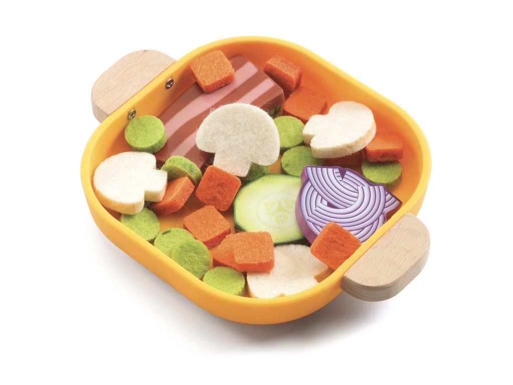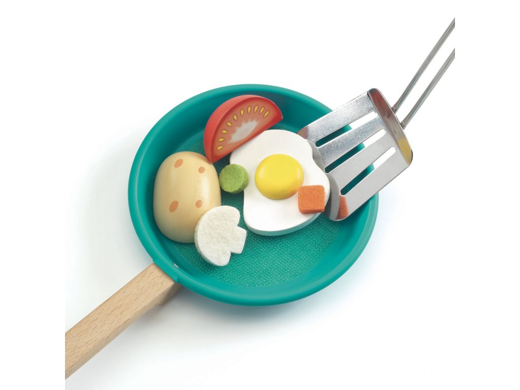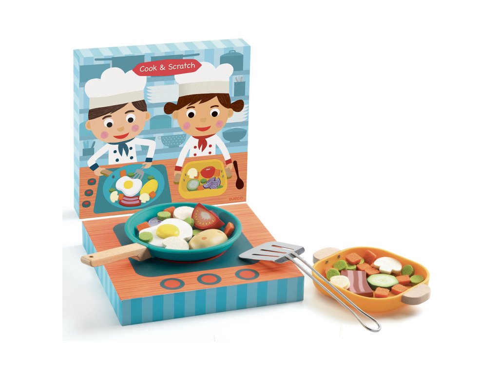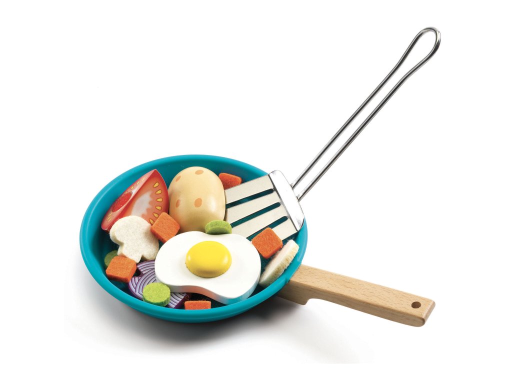 Detská súprava na varenie a praženie Varenie na skúšku: panvica, ingrediencie a „škrabanie“ ako naozajDetská súprava na varenie je zábavná drevená sada, ktorá prináša do hry realistický prvok – panvica má špeciálne dno, na ktoré sa jedlo „prichytí“ a dieťa ho môže škrabkať vareškou. Ideálne na hru v kuchynke aj na „reštauráciu“.Rýchly prehľad odporúčaný vek: od 3 rokov téma: varenie, napodobňovanie rozvíja: predstavivosť, jemnú motoriku, sociálnu hruPrečo si ju deti zamilujú zábavný „škrabací“ efekt pri miešaní veľa dielikov na tvorbu vlastných receptov kompaktné balenie – dobré aj na prenášanie kvalitné spracovanie z drevaAko sa hrá Vyberte ingrediencie a „opekajte“ ich na panvici. Vareškou miešajte a škrabkajte dno – ako v skutočnej kuchyni. Servírujte na tanier a podávajte hosťom.Obsah balenia 1× panvica so špeciálnym dnom 1× vareška/obracačka 1× tanier 6× drevený dielik + 28× filcový dielik (ingrediencie)Technické parametre materiál: drevo (FSC®), textil odporúčaný vek: 3+