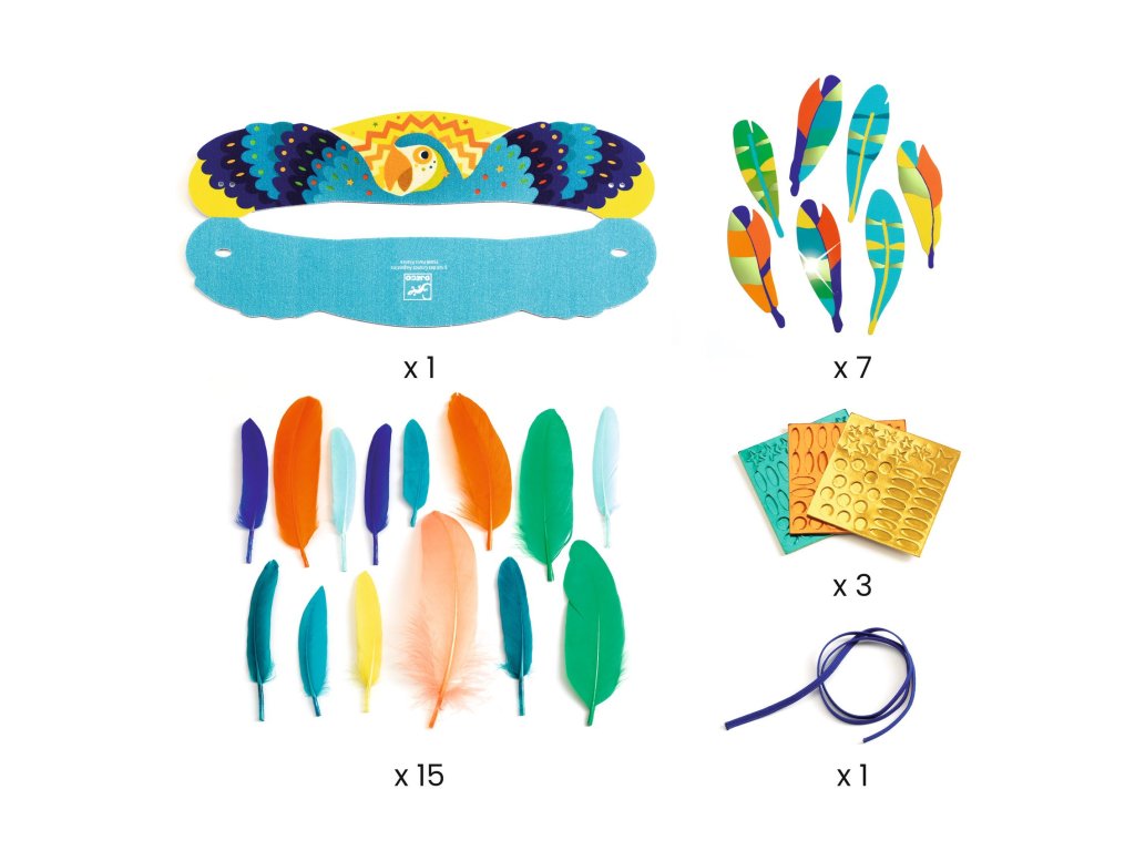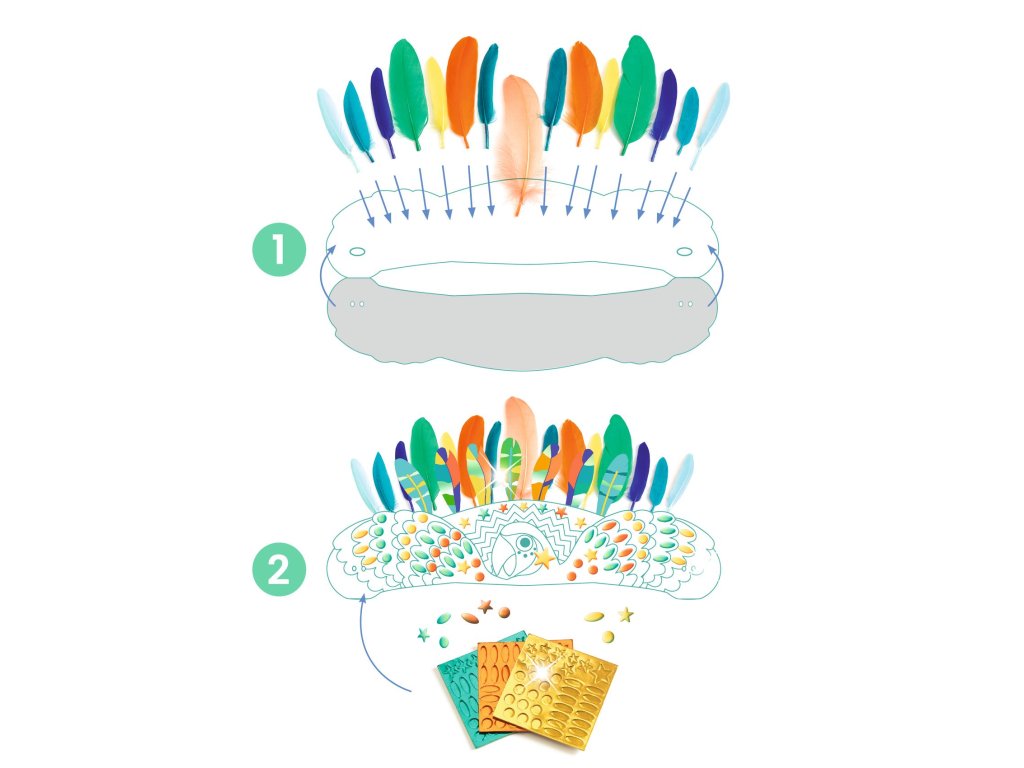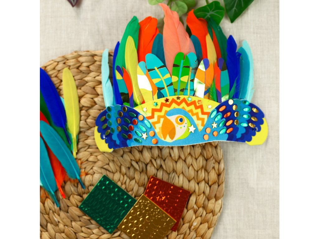 DIY Kreatívna súprava Rio čelenka Karneval v štýle Rio: vytvor si tropickú čelenku s pierkami a metalickými mozaikamiDIY Kreatívna súprava Rio čelenka je parádny set na výrobu slávnostnej čelenky. Textilná čelenka má vo vnútri samolepiacu plôšku, do ktorej deti ukladajú farebné pierka. Po uzavretí čelenky sa predná časť dozdobí metalickými mozaikovými nálepkami podľa predtlačených farebných liniek. Výsledok je efektný doplnok na oslavu, karneval či tematickú hru.Rýchly prehľad odporúčaný vek: od 5 rokov rozvíja: kreativitu, jemnú motoriku, cit pre detail výsledok: tropická čelenka s pierkami a lesklými detailmiAko sa s tým tvorí Otvor čelenku a poukladaj pierka na samolepiacu časť. Čelenku uzavri a upevni. Dozdob prednú časť metalickými nálepkami podľa návodu.Obsah balenia 1× textilná čelenka so samolepiacou plôškou 15× farebné syntetické pierko + 7× ilustrované pierko s metalickým efektom 3× hárok penových mozaikových nálepiek 1× široká plochá gumička 1× návod krok za krokomTechnické parametre vek: od 5 rokov materiál: textil, papier/kartón, pierka, nálepky
