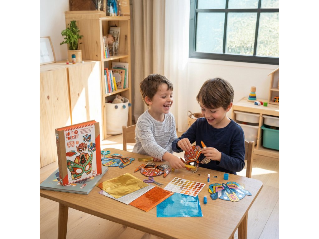 DIY Vyrob si sám Masky Roboti Vytvor si vlastné masky super robotov. Kreatívna sada štyroch masiek super robotov na ozdobenie farebnými fóliami s metalickým leskom. Na ilustrovaných maskách sú lepivé plôšky, vďaka čomu je aktivita čistá, bez potreby použiť lepidlo. Dieťa pritlačí hárok fólie určitej farby na lepivú plôšku, hárok stiahne a plôška zostane polepená metalicky lesklou fóliou. Takto vyplní všetky plôšky.Deti si precvičia jemnú motoriku a koncentráciu. Pre každú masku je pribalená elastická šnúrka, ktorú pristrihnete podľa obvodu hlavy a uviažete na masku. Sada je výborná na spoločné tvorenie a hru viacerých detí. Sada je vyrobená z papiera a lepenky s ekologickým certifikátom FSC®. Kolekcia DIY (Vytvor si sám) má blízko k úžitkovému umeniu a umožňuje deťom zhotoviť umelecké výrobky, ktoré si môžu nielen hrdo vystaviť, ale ich aj používať. Obsah: 4 masky s lepivými plôškami, 30 hárkov farebných fólií s metalickým leskom, 4 farebné elastické šnúrky (gumičky), 1 obrázkový návod. Rozmery masiek: 22 x 16 cm.