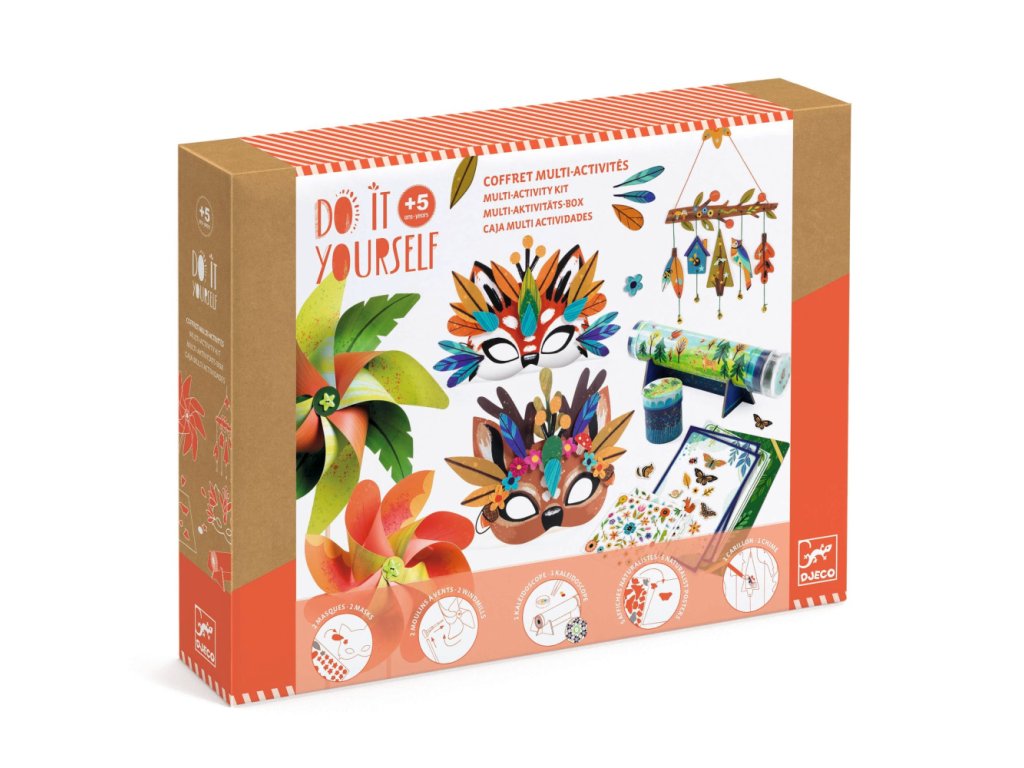 Príroda v strede záujmu! Sada 5 kreatívnych aktivít obsahuje všetko potrebné na zhotovenie 12 výtvorov, ktoré spája téma prírody. Vzniknú 2 zvieracie masky (hráme sa na zvieratá), 2 vrtuľky a 1 zvonkohra (hráme sa s vetrom), 6 plagátikov (vytvárame kategórie) a 1 kaleidoskop (pozorovanie je magická činnosť). Sada vystačí na hodiny kreatívnej zábavy a je vhodná aj pre skupinku detí.Papier a kartón použitý na výrobu sady má ekologický certifikát FSC®. Kolekcia Vytvor si sám (DIY) má blízko k úžitkovému umeniu a umožňuje deťom zhotoviť umelecké výrobky, ktoré si môžu nielen hrdo vystaviť, ale ich aj používať.Obsah: 2 masky na ozdobenie: 80 ks ilustrovaných papierových dielov, 2 hárky obojstranných lepiek, 2 elastické šnúrky (gumky); 2 vrtuľky na poskladanie: 4 hárky s vyrezanými ilustrovanými dielmi, 2 drevené paličky, 2 plastové koncovky (čiapočky); 1 kaleidoskop na poskladanie: 1 ilustrovaný tubus, násada s krytkou (plast) na vloženie farebných dielikov a kotúčov na pozorovanie, 3 zrkadlá (zrkadlová fólia), 1 okulár so šošovkou (plast a papier), 1 pinzetka, 11 ilustrovaných kotúčov, 50 ks farebných dielikov, škatuľka s vekom na uskladnenie dielikov a kotúčov, ilustrovaný stojan; 6 obrázkov (plagátov) s prírodnými motívmi na dotvorenie: 4 hárky samolepiek (zvieratká a rastlinky), 1 hárok samolepiacich menoviek, odkladacia mapa s gumičkou; 1 závesná dekorácia (zvonkohra) na ozdobenie: 2 hárky obtlačkov, 7 ilustrovaných dielov, 2 ks farebných šnúr, 5 zvončekov; 1 obrázkový návod pre každú aktivitu
