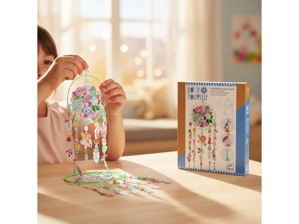 DIY Vyrob si sám Slnečný záves s vtáčikmi Slnečné odlesky v izbe: poskladaj jemný záves s vtáčikmi, korálkami a priesvitnými prvkami k oknuSlnečný záves s vtáčikmi je kreatívna sada, v ktorej si deti vytvoria poetickú dekoráciu na zavesenie k oknu.Na kovový kruh postupne pripevnia viac než 80 ozdobných dielikov, doplnia ich fazetovanými korálkami a flitrami a všetko zavesia na priesvitnú niť, aby záves pôsobil ľahko a vzdušne.Keď naň zasvieti slnko, priesvitné prvky a korálky vytvoria jemné odlesky – ideálne ako dekorácia do detskej izby, ktorá vyzerá krásne cez deň aj večer.Všetko je pripravené tak, aby deti mohli tvoriť krok za krokom podľa obrázkového návodu.Rýchly prehľad odporúčaný vek: od 7 rokov rozvíja: jemnú motoriku, trpezlivosť, sústredenie, cit pre estetiku v balení: kovový kruh 16 cm, priesvitná niť, 80+ dielikov, korálky a flitre, samolepiace bodky, návodPrečo si ho deti zamilujú vznikne skutočná dekorácia do izby – hotový výrobok sa dá hneď zavesiť kombinácia priesvitných prvkov a korálok vytvára slnečné odlesky tvorenie je prehľadné – dieťa vidí výsledok rásť po jednotlivých závesoch jemné navliekanie podporuje precíznosť a trpezlivosťAko to funguje Priprav si kruh a roztrieď dieliky podľa tvarov a farieb. Pomocou priehľadných samolepiacich bodiek pripevni ozdoby na určené miesta. Odmeraj a nastrihaj priesvitnú niť, navliekaj korálky a pridávaj ozdoby podľa návodu. Jednotlivé závesy uviaž na kruh tak, aby mali peknú dĺžku a rozostupy. Zaves hotový záves k oknu a nechaj ho chytať svetlo.Obsah balenia 1× kovový kruh (priemer 16 cm) 4 m priesvitnej nite 80+ ozdobných dielikov s motívmi vtáčikov a prírody 1× balenie korálikov a flitrov 1× hárok priehľadných samolepiacich bodiek 1× obrázkový návod krok za krokomTechnické parametre rozmer hotovej dekorácie: cca 16 × 50 cm materiál: kov, plastové/priesvitné prvky, niť rozmery balenia: cca 20 × 26 × 4,5 cm