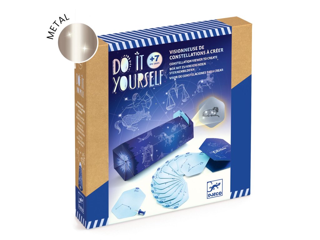 DIY Vyrob si sám SúhvezdiaObjavte krásy nočnej oblohy a vytvorte si vlastný prehliadač hviezdKreatívna sada DIY – Súhvezdia od Djeco prináša deťom originálny spôsob, ako spoznať nočnú oblohu a 26 známych súhvezdí — znamenia zverokruhu aj zvieracie súhvezdia. Deti si pomocou dierovačky označia hviezdy na kartách a potom ich vložia do vlastnoručne zloženého prehliadača. Keď sa cez neho pozrú, pred očami sa im zjaví skrytá ilustrácia súhvezdia. Súčasťou sady je aj brožúrka, ktorá pomôže deťom umiestniť súhvezdia na oblohu. Ide o jedinečné spojenie tvorenia, hry, jemnej motoriky a vzdelávania. Produkt je vyrobený z FSC® certifikovaného papiera a kartónu, čo zaručuje ekologicky zodpovednú výrobu.Produkt ponúka:26 súhvezdí na preskúmanie — znamenia zverokruhu aj zvieracie súhvezdiatvorivú aktivitu (prehliadač aj hviezdne karty)efekt objavovania: skrytá ilustrácia súhvezdí sa objaví až cez prehliadačkvalitné vyhotovenie kartičiek a prehliadačapodrobný návodIdeálne na to, aby deti od 7 rokov objavili krásu nočnej oblohy a začali pozorovať hviezdy.Kolekcia DIY (Vytvor si sám) má blízko k úžitkovému umeniu a umožňuje deťom zhotoviť si umelecké výrobky, ktoré si môžu nielen hrdo vystaviť, ale ich aj používať.Obsah balenia:prehliadač na zostaveniedrevený krúžok4 hárky nálepiek26 dierovacích kartičiek so súhvezdiami + úložné puzdrodierovačkadierovacia doskabrožúrka / návod so súhvezdiamipodrobný obrázkový návod