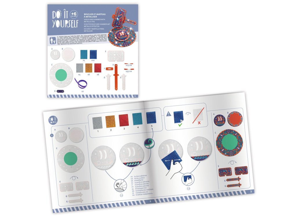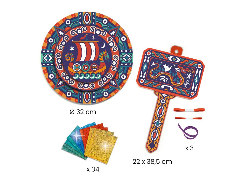 DIY Vyrob si sám Vikingské kladivoKreatívna sada na výrobu vikingského kladiva a štítuDIY – Vytvor si sám: Ako Viking je zábavná a originálna kreatívna sada značky Djeco, ktorá deti vtiahne do sveta starých severských bojovníkov. Deti si z tejto sady vytvoria vlastné vikingské kladivo a štít, ktoré môžu následne použiť pri hre alebo ako dekoráciu.Prečo si vybrať túto kreatívnu sadu od Djecovhodná pre deti od 6 rokovvýroba veľkého štítu (cca 32 cm) a kladiva (cca 38 cm)jednoduchá technika lepenia fólií podľa čísel v návodevýsledok s kovovým leskom a realistickým vzhľadomponúka tvorivú, zručnosť rozvíjajúcu aktivituvyrobené z papiera a kartónu s ekologickým certifikátom FSC®Obsah balenia1 štít z 4 hrubých kartónových dielov s lepiacimi plochami2 semišové stuhy na uchytenie štítu1 kladivo z 5 hrubých kartónových dielov s lepiacimi plochami2 farebné saténové stuhy na kladivo34 fóliových listov na dekoráciupodrobný obrazový návod krok za krokom