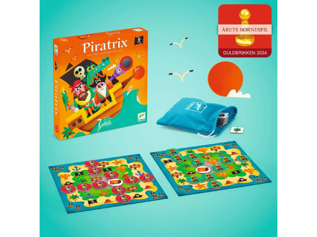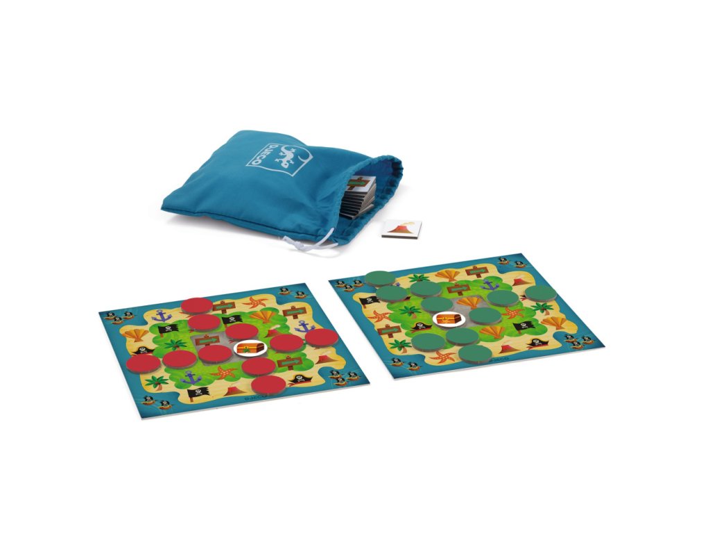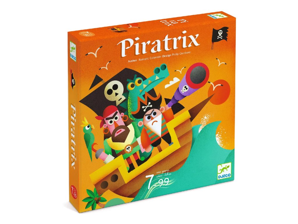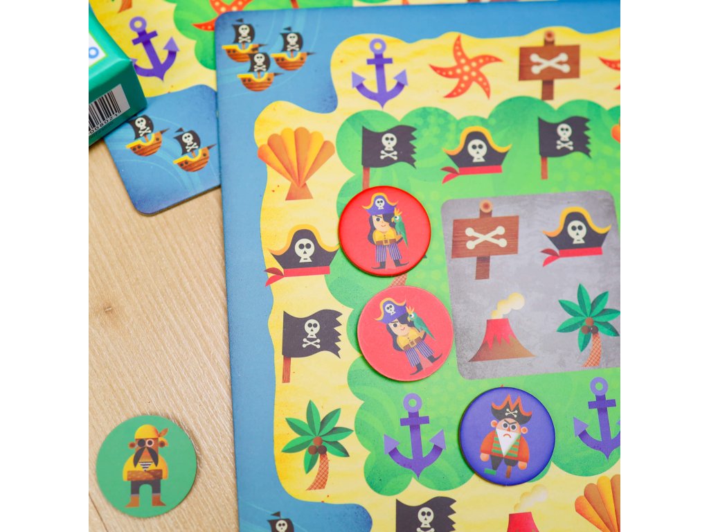 Hra Piratrix Piráti, ide sa hľadať poklad! Stolová strategická hra. Každý hráč má svoju hernú dosku, ktorá predstavuje mapu pokladu. Na hernej doske sú obrázkové políčka, po ktorých hráči presúvajú pirátske žetóny. Hra rozvíja strategické myslenie Cieľom je usporiadať žetóny do 2 línií tak, aby sa krížili v mieste truhlice s pokladom. Kto bude prvý? Pre ťahy žetónmi platia presné pravidlá.Obsah: 4 herné dosky, 4 sady po 10 žetónov s pirátmi, 4 žetóny s truhlicou, 35 obrázkových doštičiek, 1 látkové vrecko, pravidlá hry.