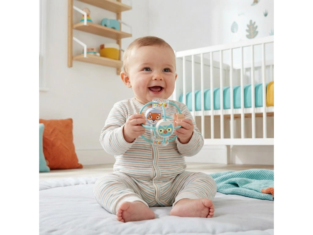 Hrkálka Lesné zvieratá je ľahká zvuková hračka v tvare lopty, ktorú bábätká ľahko uchopia a s radosťou skúmajú. Pri pohybe sa v priehľadných častiach presýpajú farebné guľôčky, ktoré vytvárajú jemné hrkanie a zároveň motivujú dieťa sledovať pohyb očami.