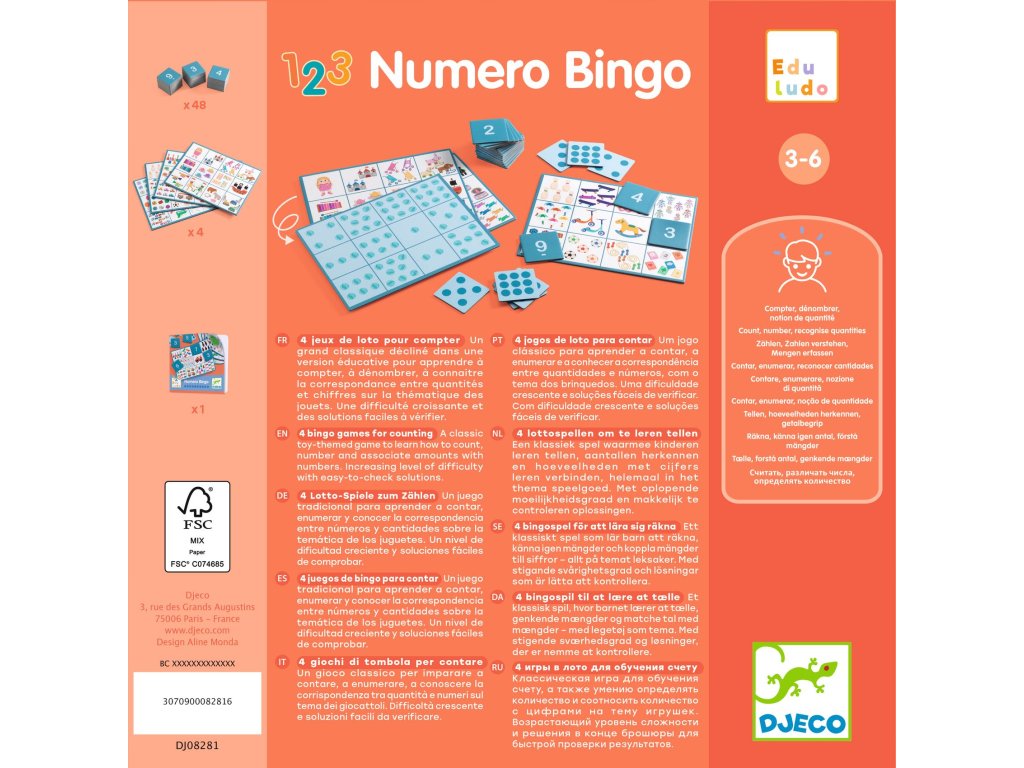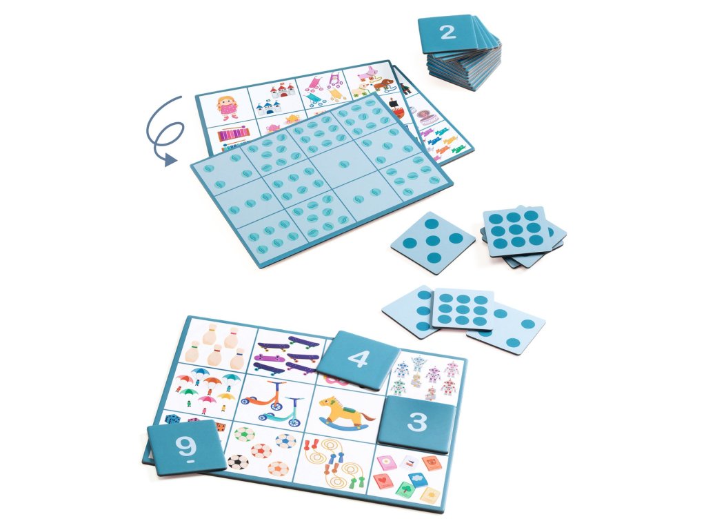 Hry na počítanie Numero Bingo Počítaj hračky a nájdi správne číslo: 4 loto hry s rastúcou náročnosťouNumero Bingo je klasické loto na počítanie, v ktorom sa deti učia počítaniu, určovaniu množstva a spájaniu množstva so číslicou – všetko na obľúbenej téme hračiek.Sada obsahuje 4 hry v jednej krabičke, pričom náročnosť postupne rastie, takže sa k nej deti vedia vracať a zlepšovať sa.Rýchly prehľad odporúčaný vek: 3 – 6 rokov čo sa deti učia: počítanie, určovanie počtu, priraďovanie čísla k množstvu 4 hry v balení: rastúca náročnosť praktické: riešenia sa dajú ľahko skontrolovať na konci zošita s pravidlami materiál: papier a kartón s certifikáciou FSCObsah balenia 4 loto herné dosky (obojstranné) 48 dielikov/žetónov (obojstranné) 1 zošit s pravidlami hierAko to funguje Vyberte si jednu zo 4 verzií hry (podľa veku a úrovne). Deti počítajú predmety (hračky) a hľadajú zodpovedajúce číslo alebo množstvo. Dieliky prikladajú na hernú dosku, kým ju správne nezaplnia. Na konci si viete výsledok jednoducho overiť podľa riešení v zošite.Pre koho je pre deti, ktoré začínajú s číslami a počítaním ako hravá príprava na škôlku/školu pre rodičov, ktorí chcú jednu sadu, ktorá vydrží dlhšie vďaka úrovniam